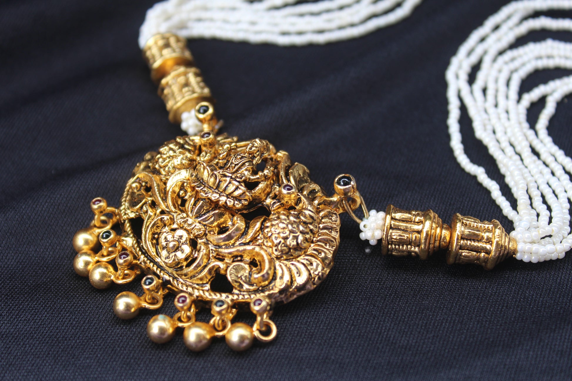 - Features a beautiful design with a detailed gold-plated pendant, intricate gold-plated beads, and multiple strands of delicate white beads.