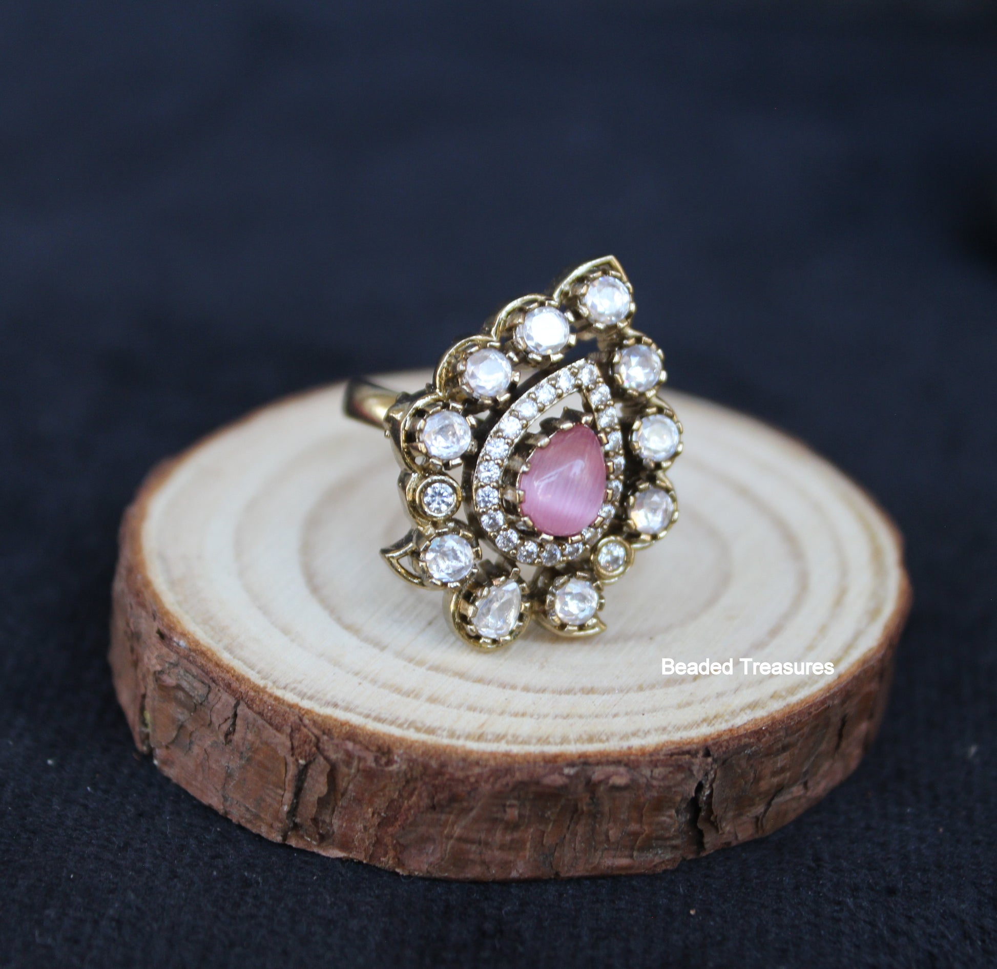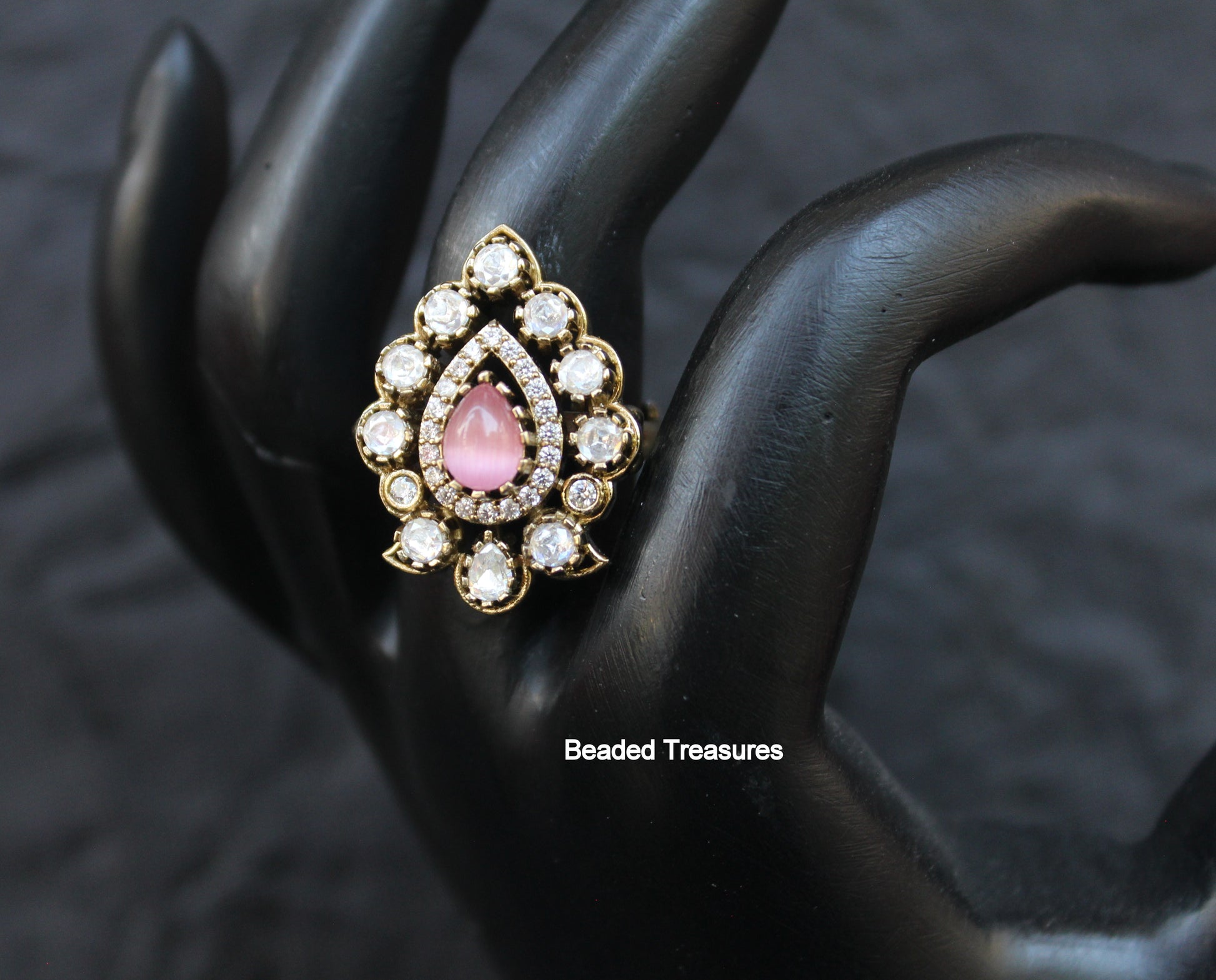 - Elegant Adjustable Antique Gold Tone Finger Ring featuring sparkling Cubic Zirconia (CZ) stones and a delicate pink stone, handcrafted by Beaded Treasures in Bengaluru.