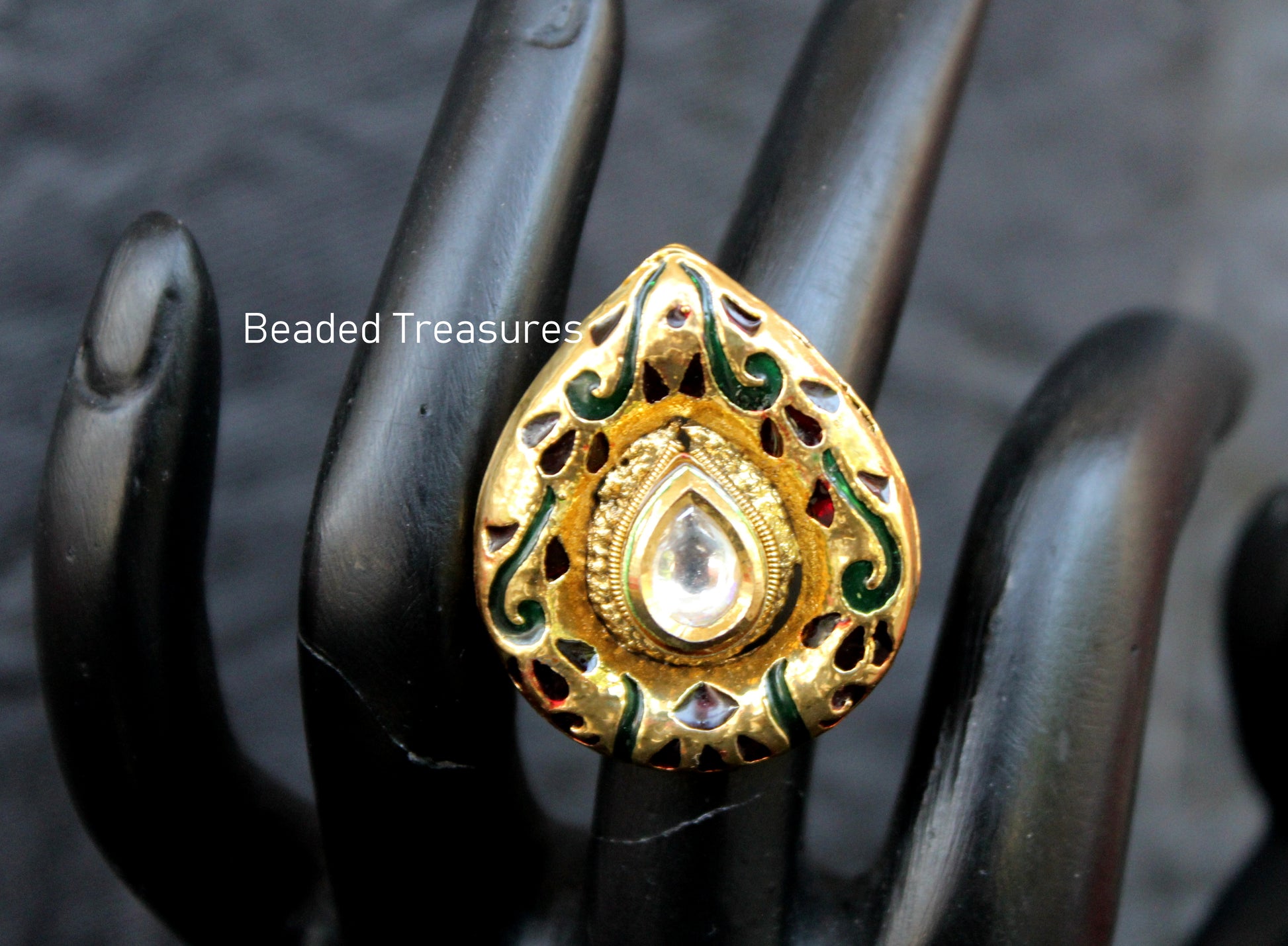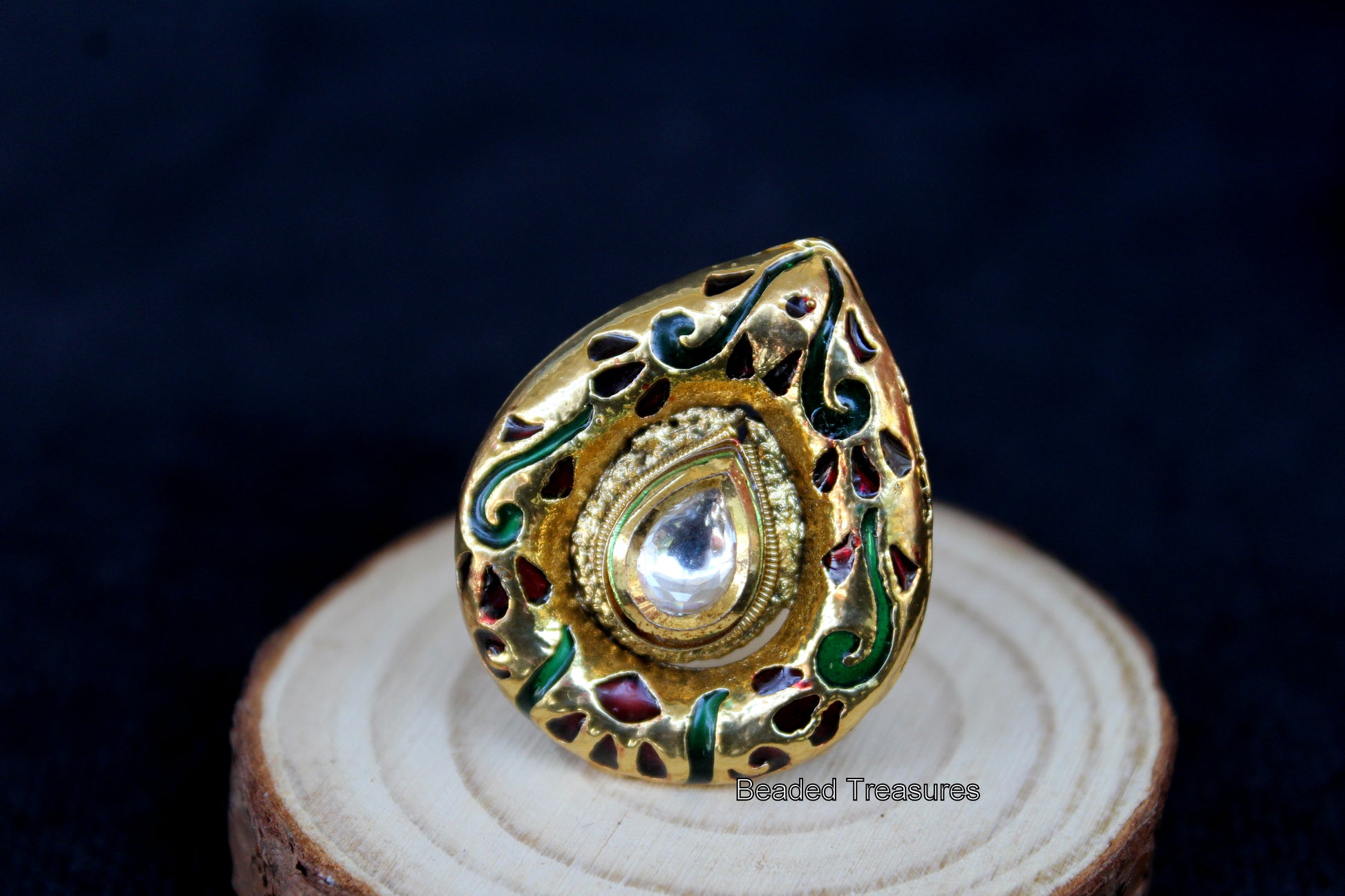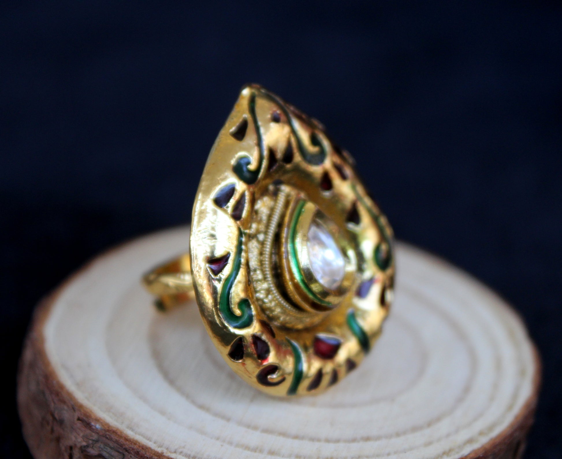 - The ring showcases a teardrop or paisley-inspired design with a central sparkling clear Kundan stone surrounded by detailed gold-toned filigree work and vibrant enamel accents in shades of green and maroon.