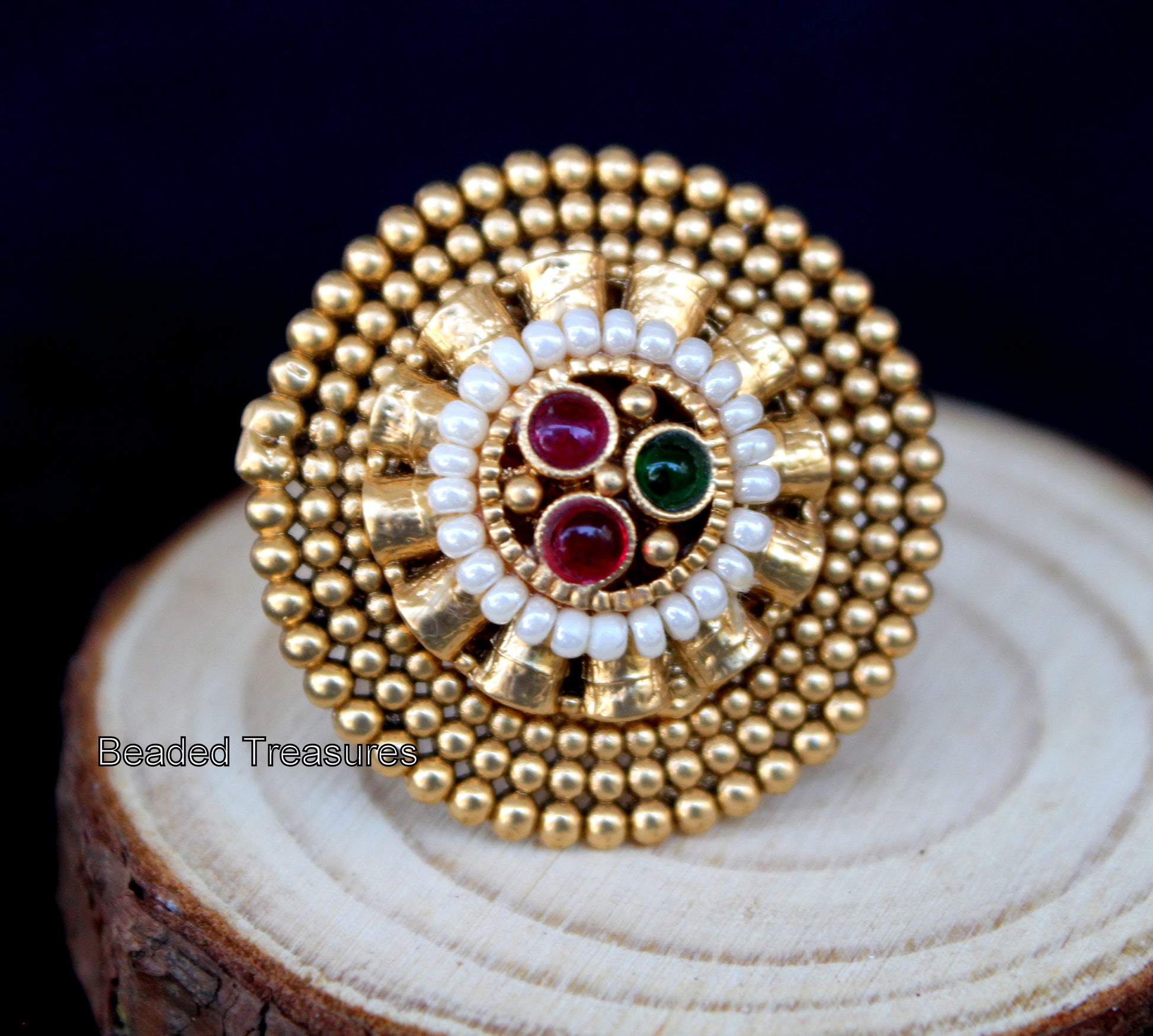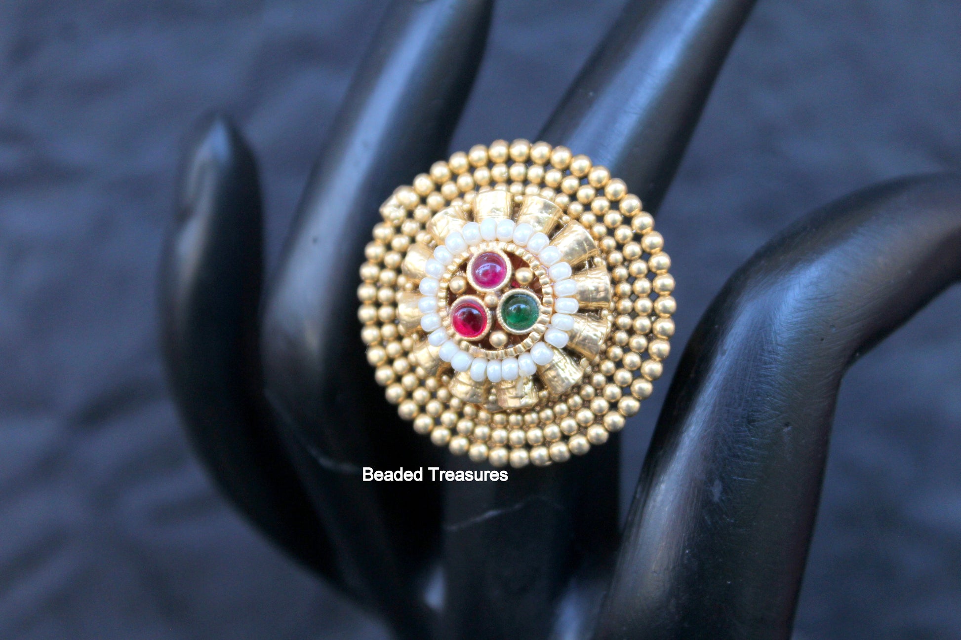 - Elegant Adjustable Gold-Toned Finger Ring featuring a traditional Kundan setting, delicate pearl accents, and vibrant ruby-like and emerald-like stones, handcrafted by Beaded Treasures in Bengaluru.