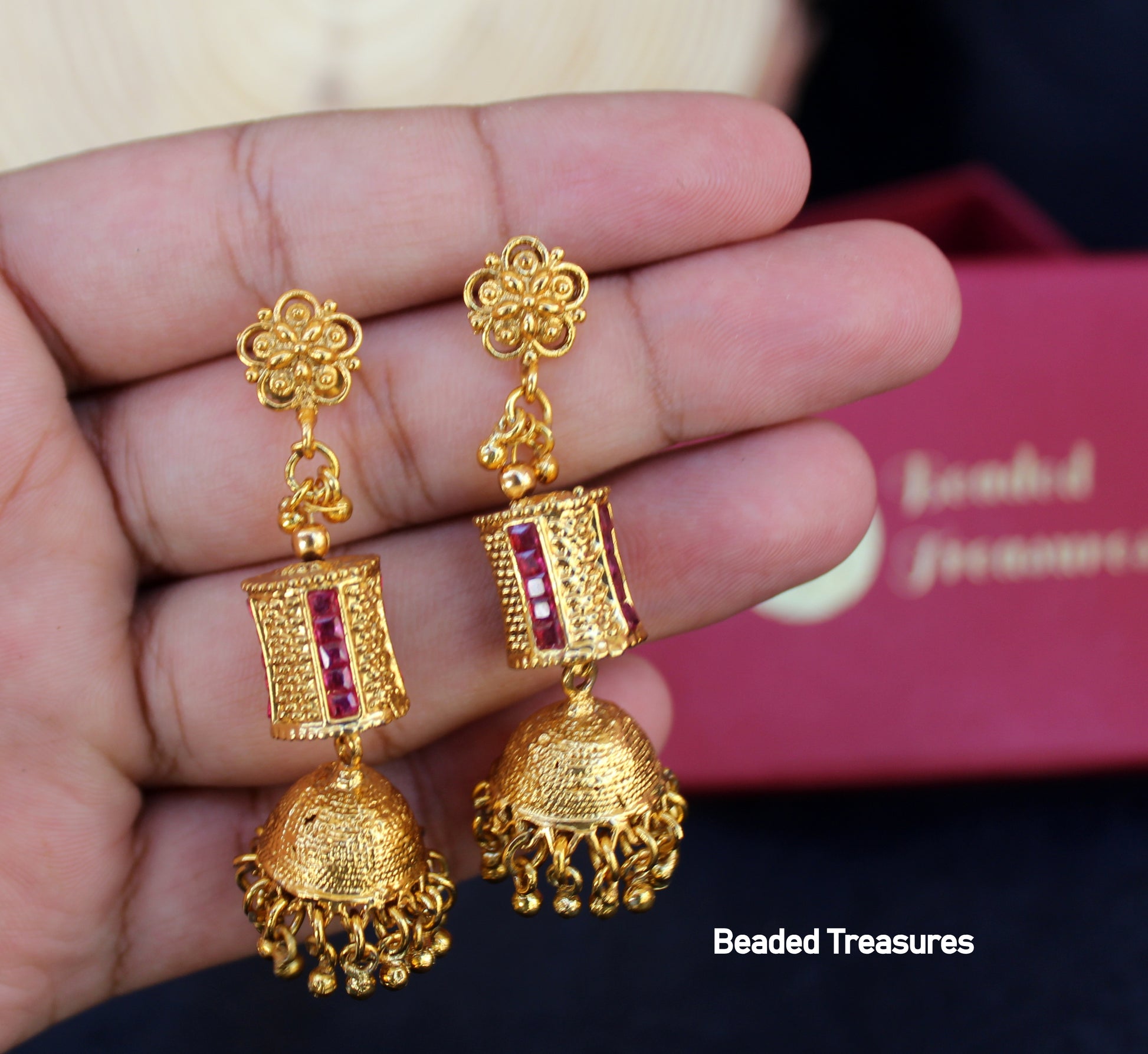 - Features a beautiful design with a floral top, a unique rectangular middle section with vibrant stone accents (ruby-like), and a classic jhumka dome with intricate detailing and small gold bead drops.