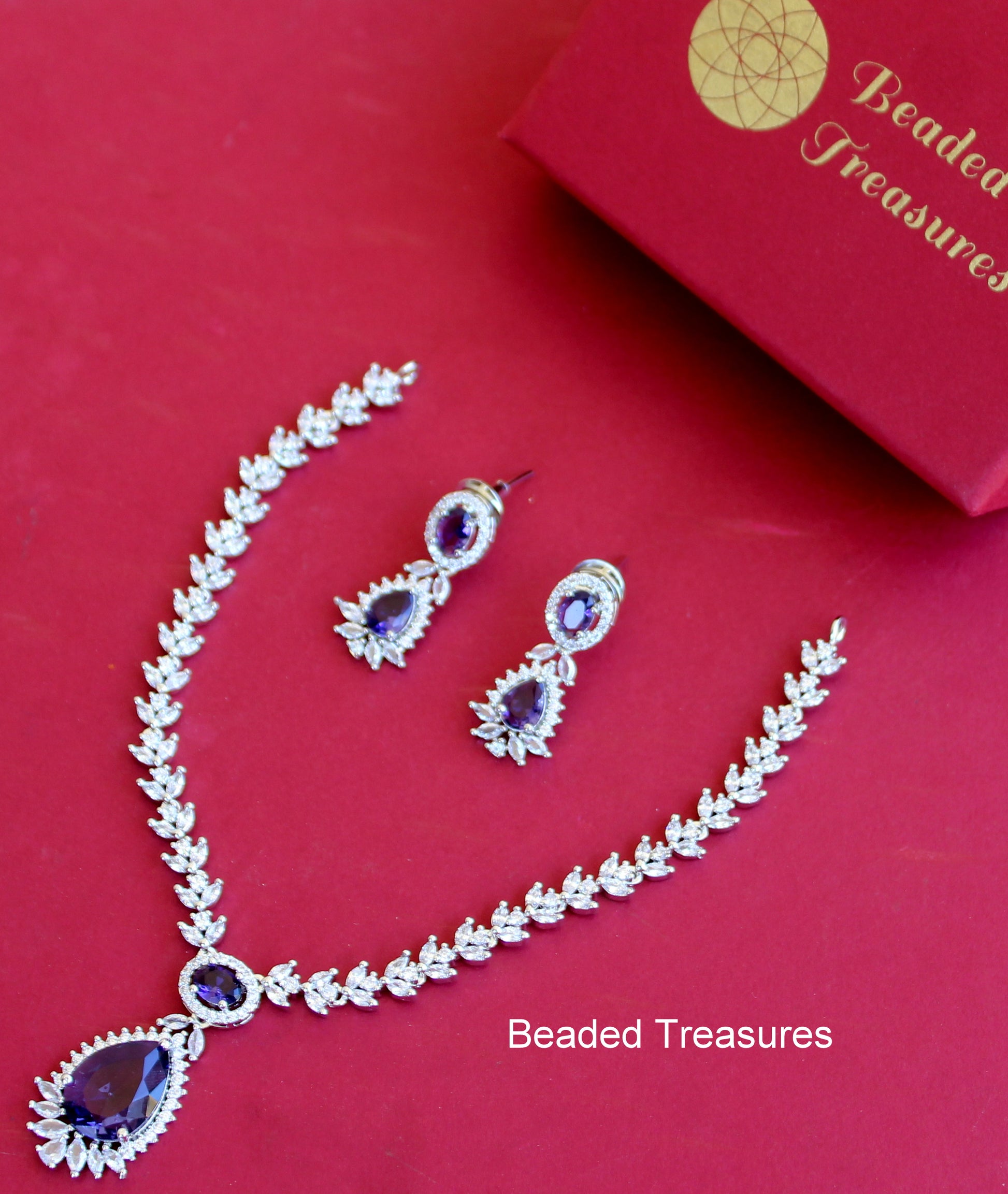- Elegant Anshi Art American Diamond Drop Necklace Set with Purple Stone Accents, handcrafted by Beaded Treasures in Bengaluru.