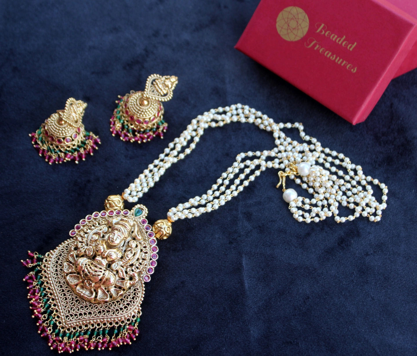 - Features a unique double-sided pendant with intricate antique detailing, Kempu and green stone accents, and pearl drops.