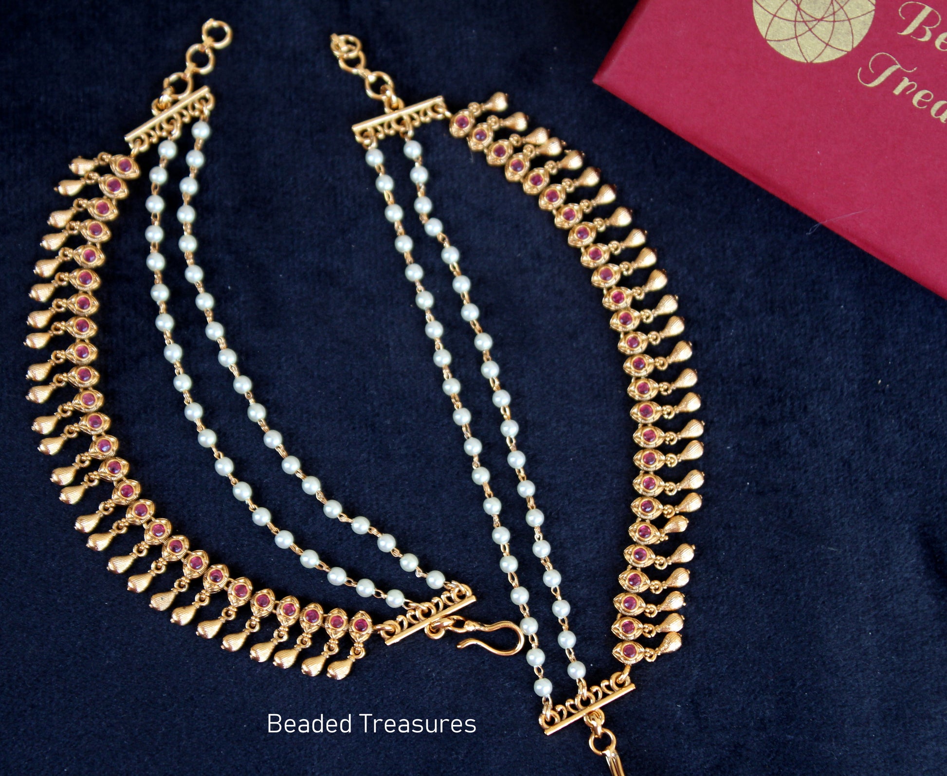 - Features a beautiful design with intricate antique gold work, vibrant Kemp (ruby-like) stones, and delicate pearl chains.
