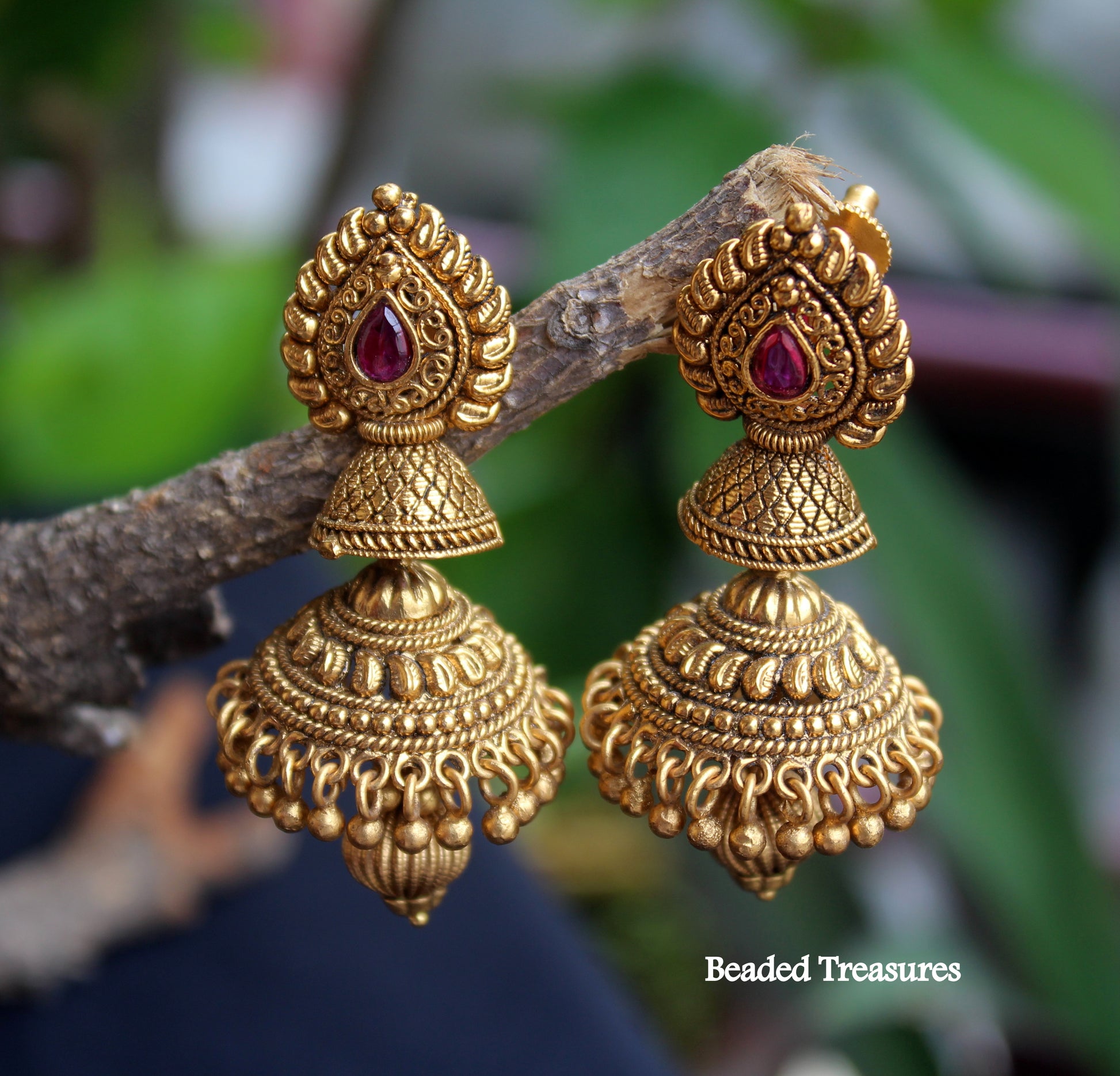 - Elegant Antique Gold Jhumka Earrings with Ruby Stone, handcrafted by Beaded Treasures in Bengaluru.