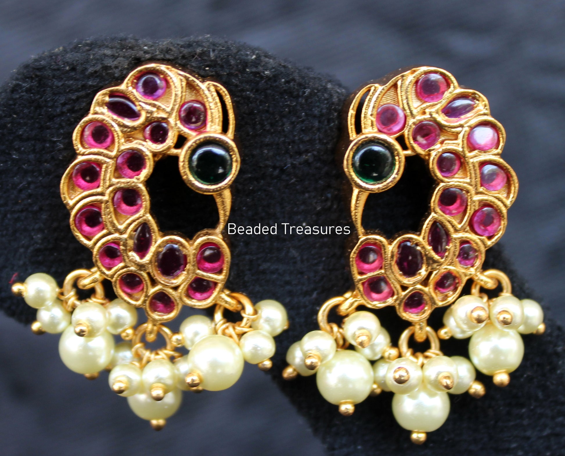 - Elegant Antique Gold Finish Earrings featuring vibrant Kemp (ruby-like) stones, a central emerald-like stone, and delicate pearl drops, handcrafted by Beaded Treasures in Bengaluru.