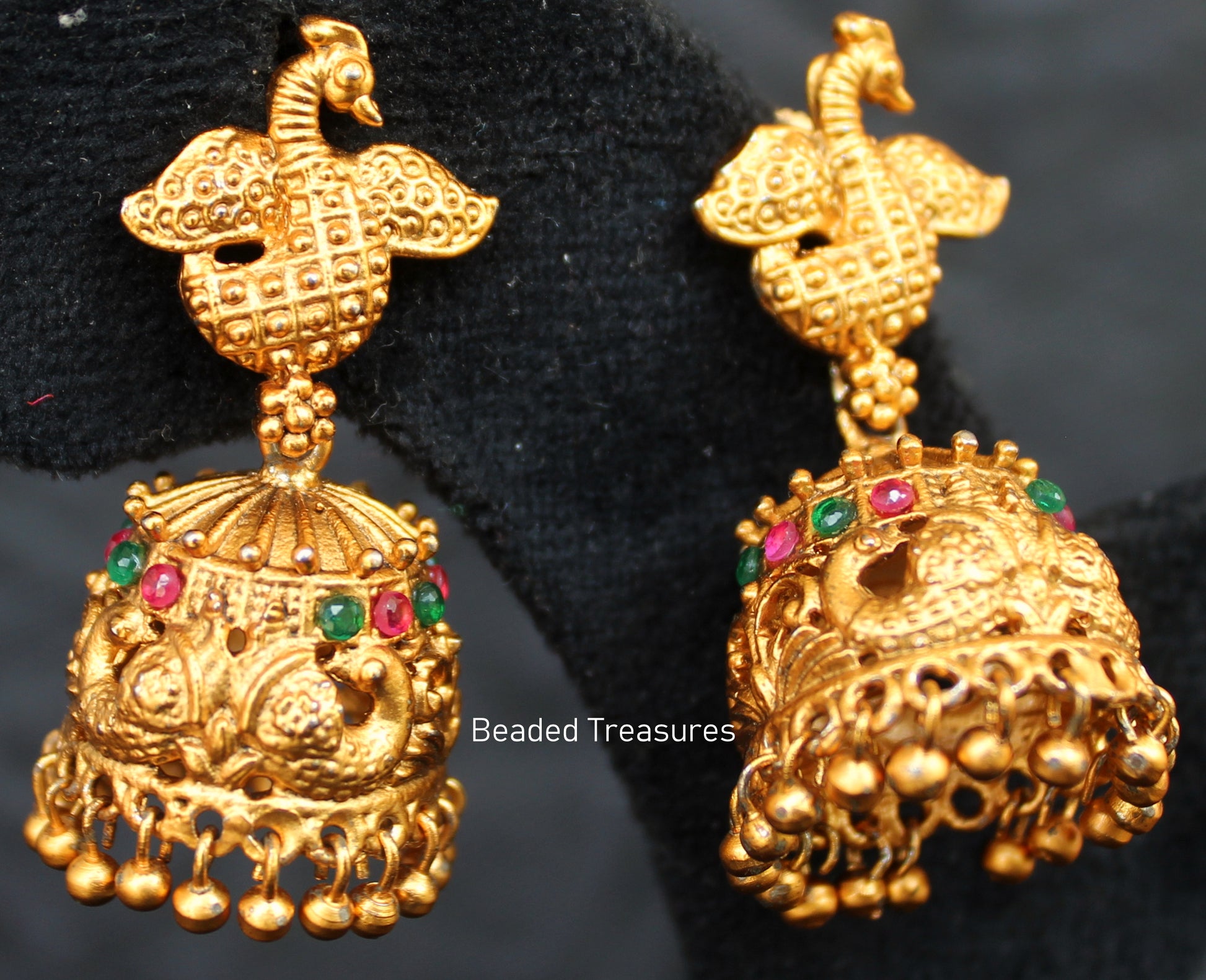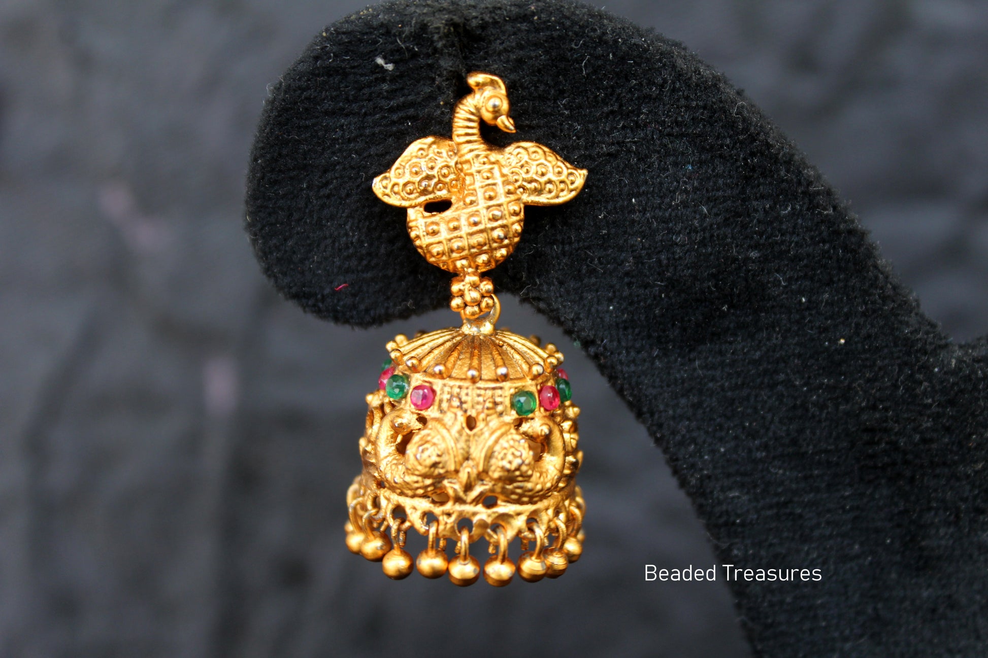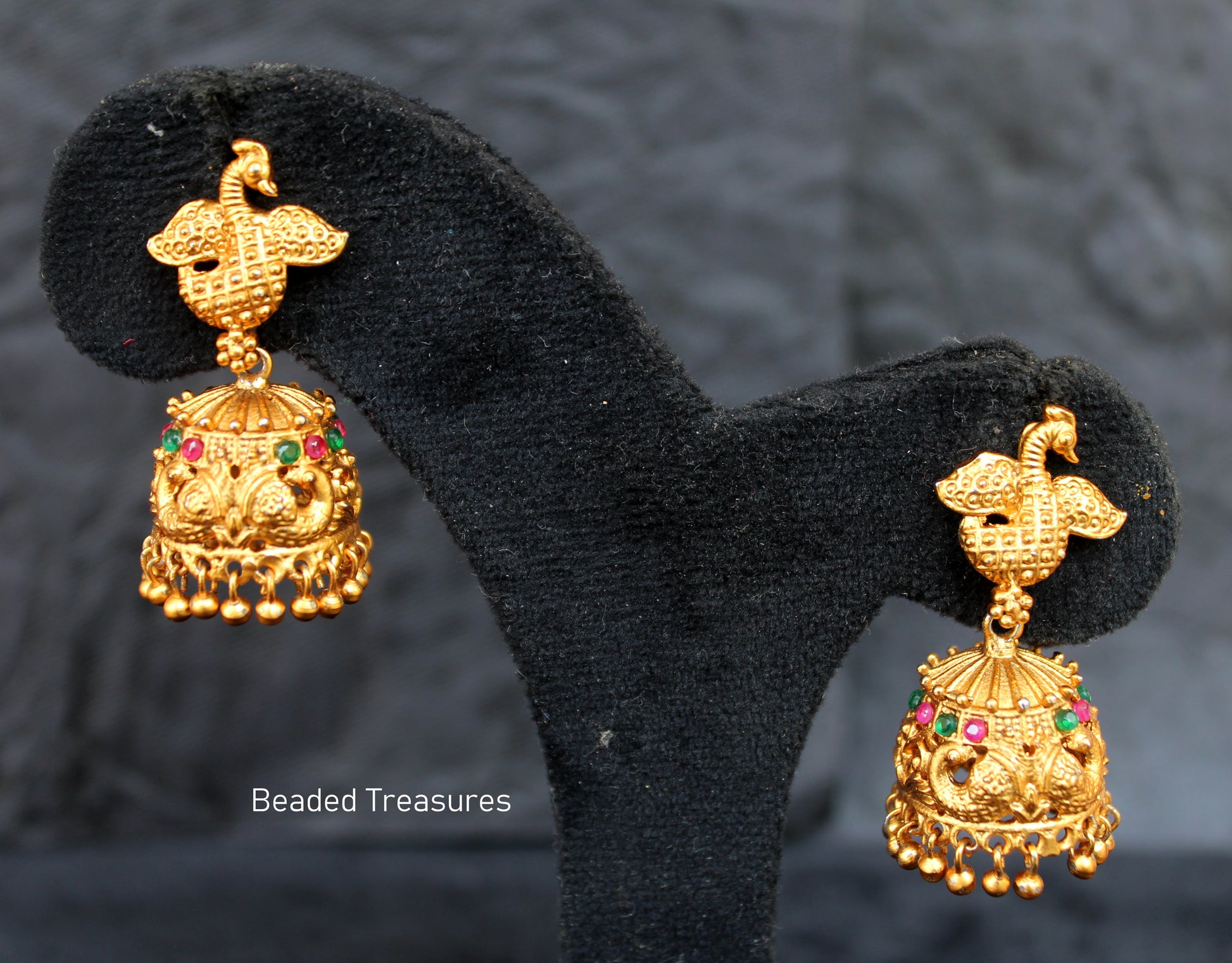 - Exquisite Antique Gold Finish Jhumka Earrings featuring a beautiful peacock design and vibrant colorful stones, handcrafted by Beaded Treasures in Bengaluru.