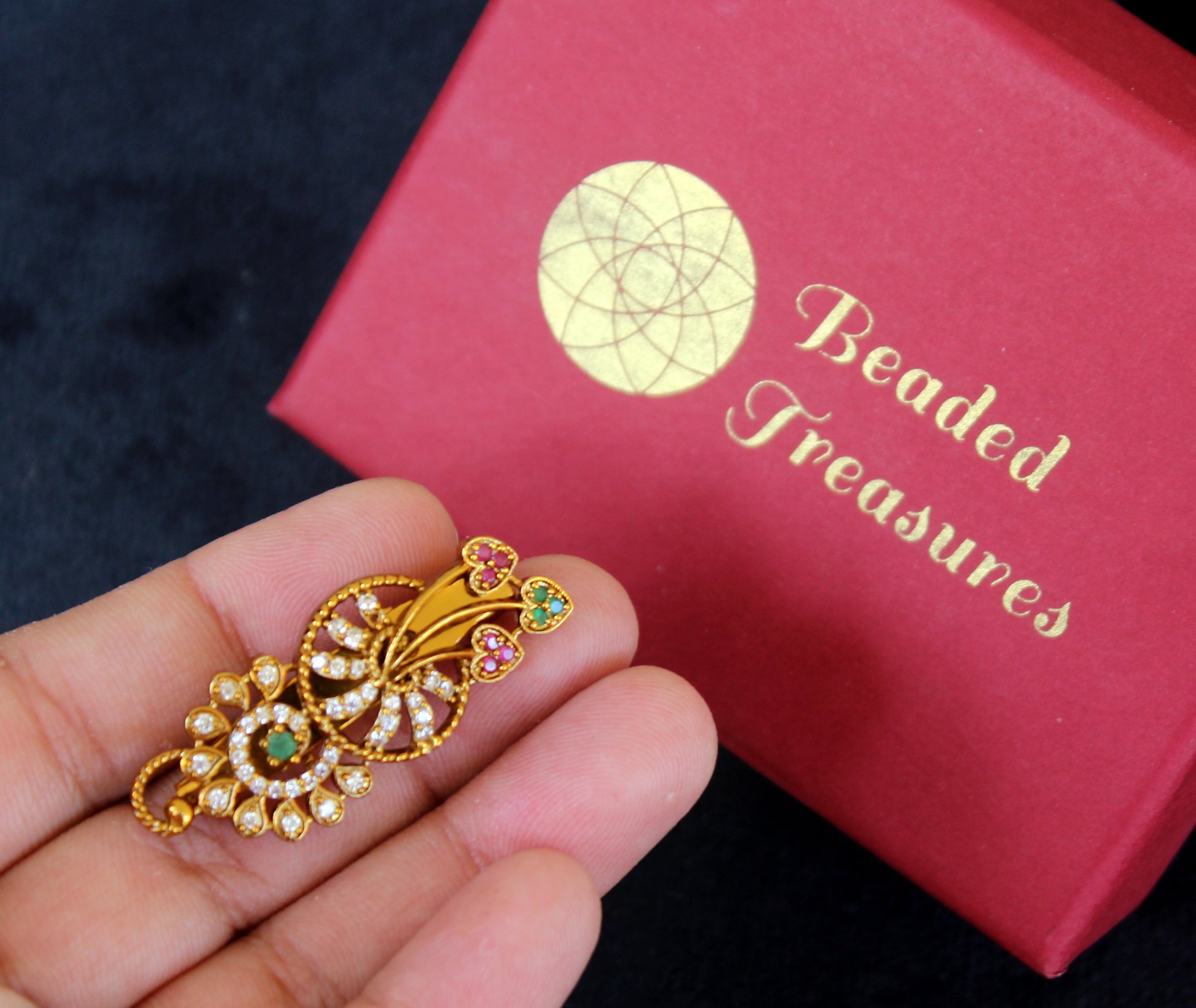 - Elegant Antique Gold Saree Pin with Kemp & Green Stones, handcrafted by Beaded Treasures in Bengaluru.