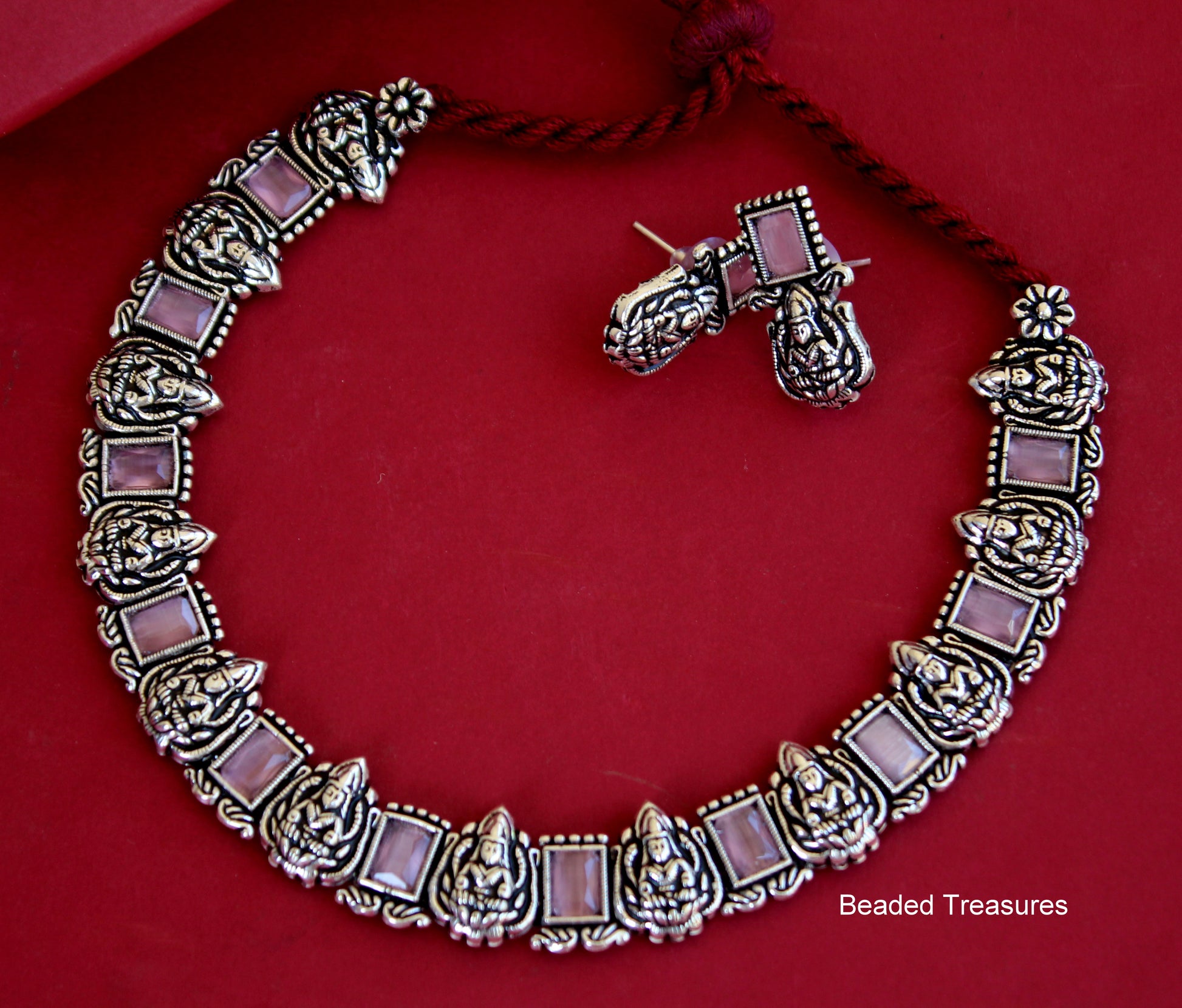 - Elegant Antique Oxidised Silver Lakshmi Kasu Necklace Set, crafted by Beaded Treasures in Bengaluru.