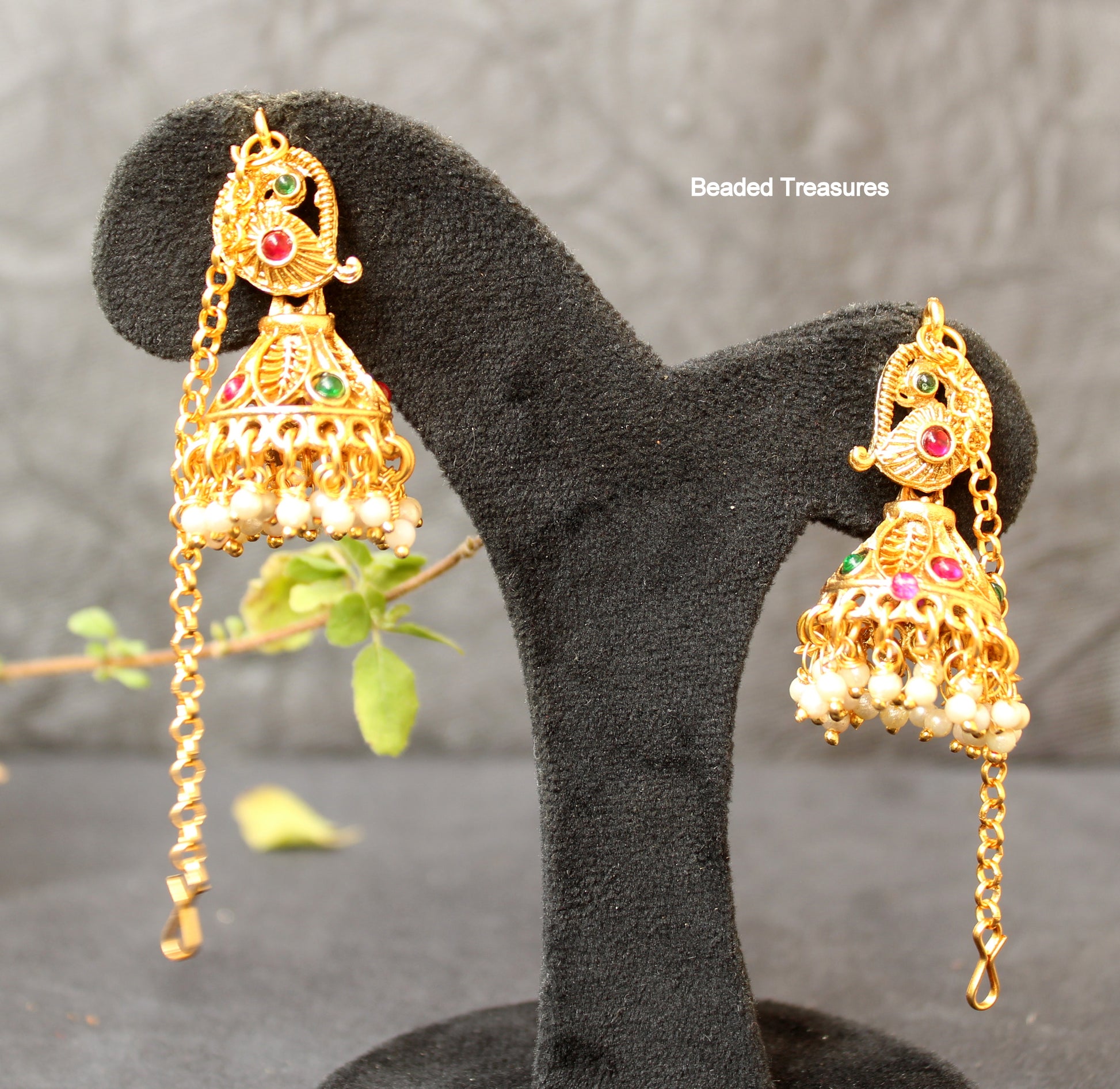 - A delicate Sahare (ear chain) is attached to the top of the earring and is designed to be hooked into the hair for added support and a classic South Indian look.