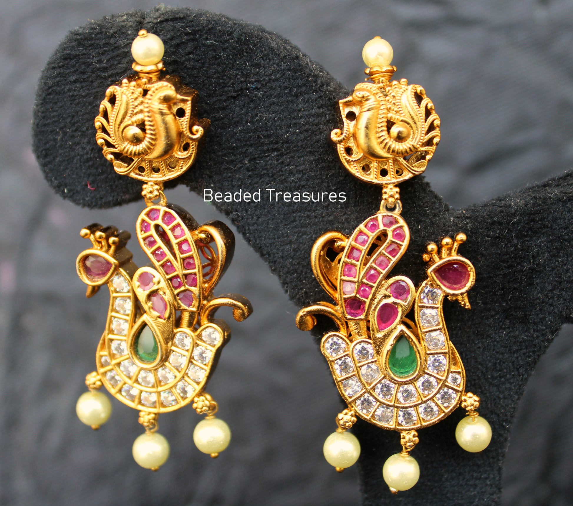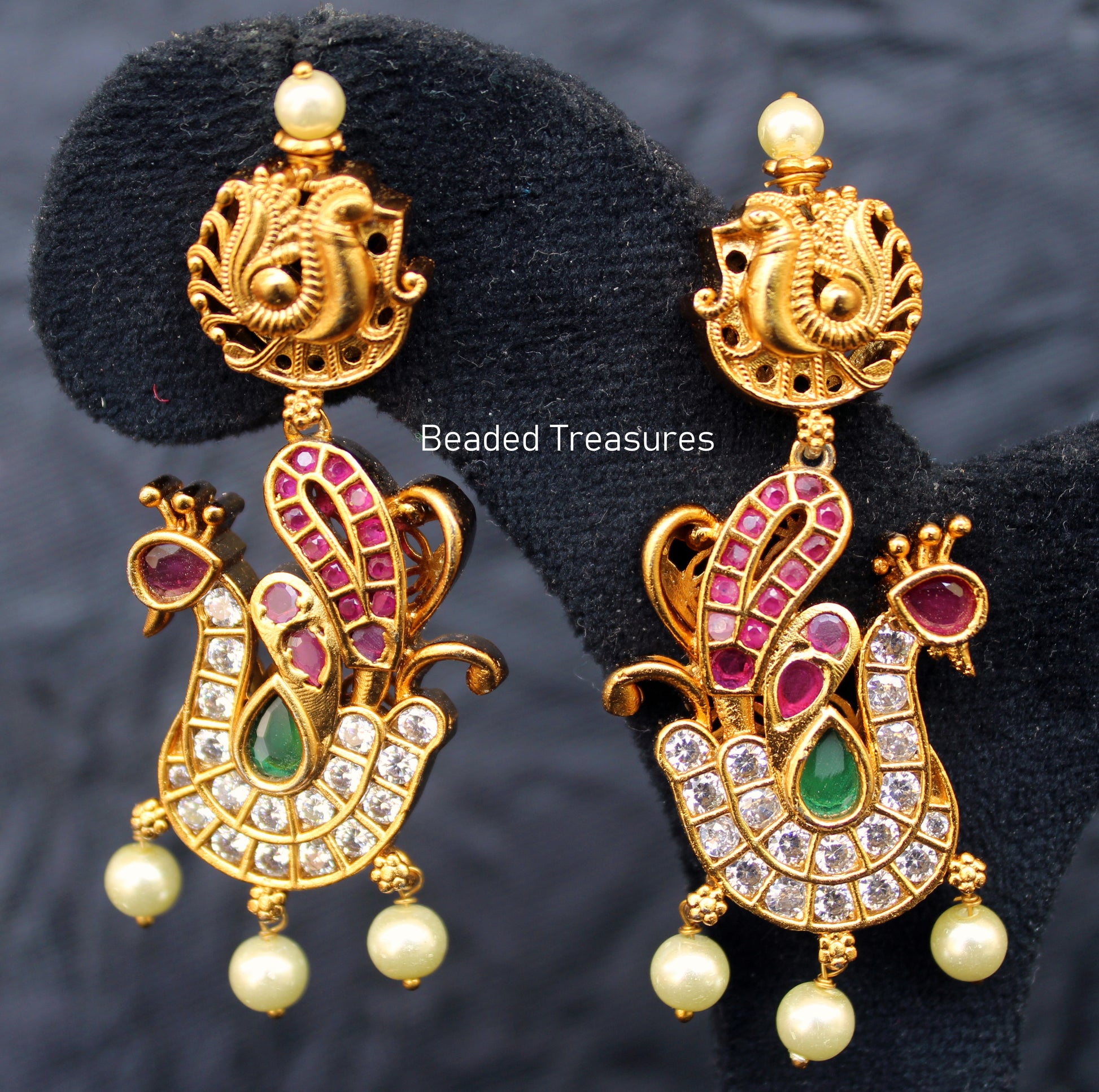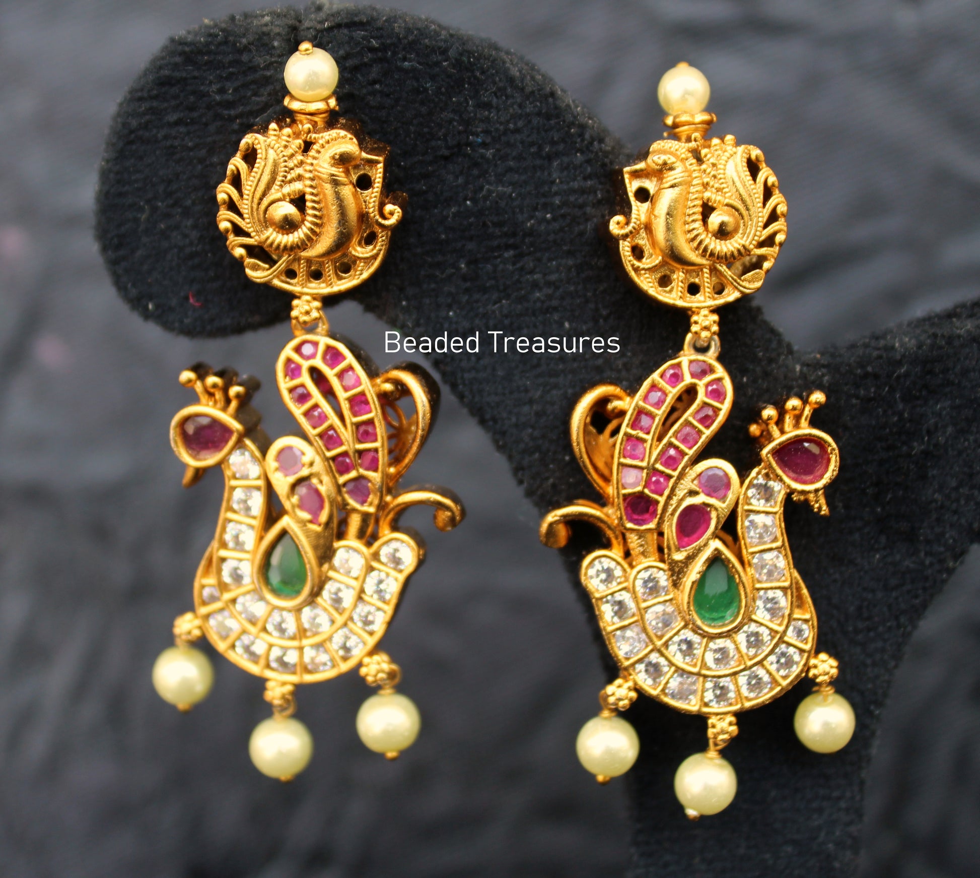 - Exquisite Antique Gold Finish Peacock Earrings featuring vibrant Kemp (ruby-like) and green stones, sparkling white stones (likely CZ), and delicate pearl drops, handcrafted by Beaded Treasures in Bengaluru.