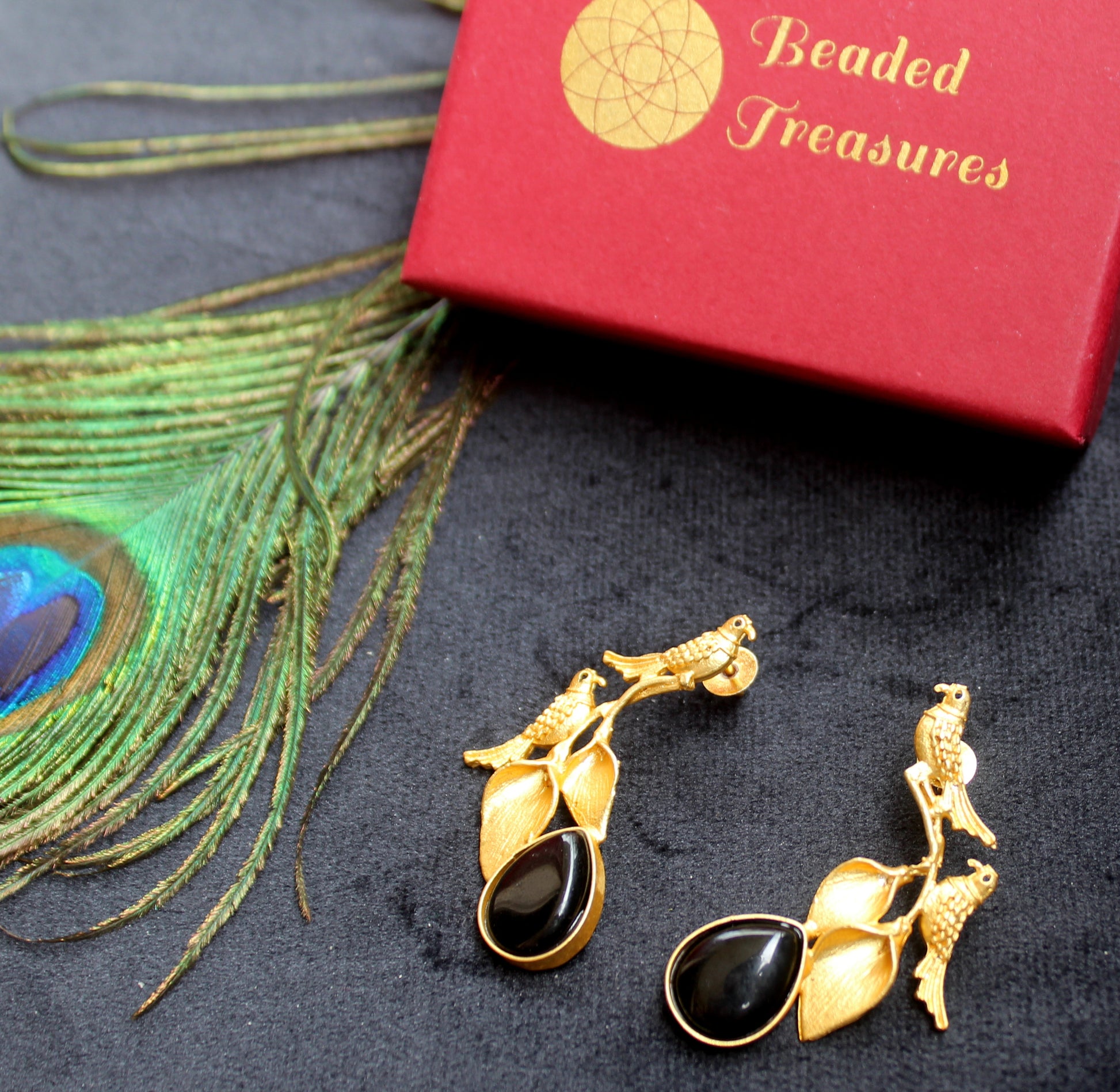 Bird and Leaf Dangler Earrings with Black Stones - Beaded Treasures