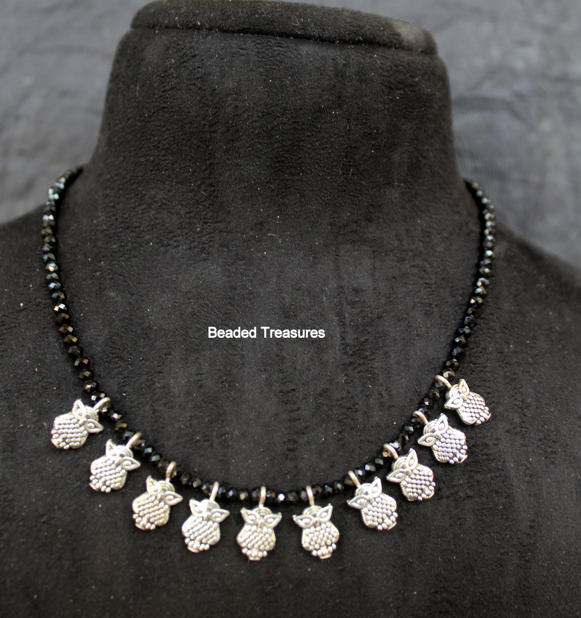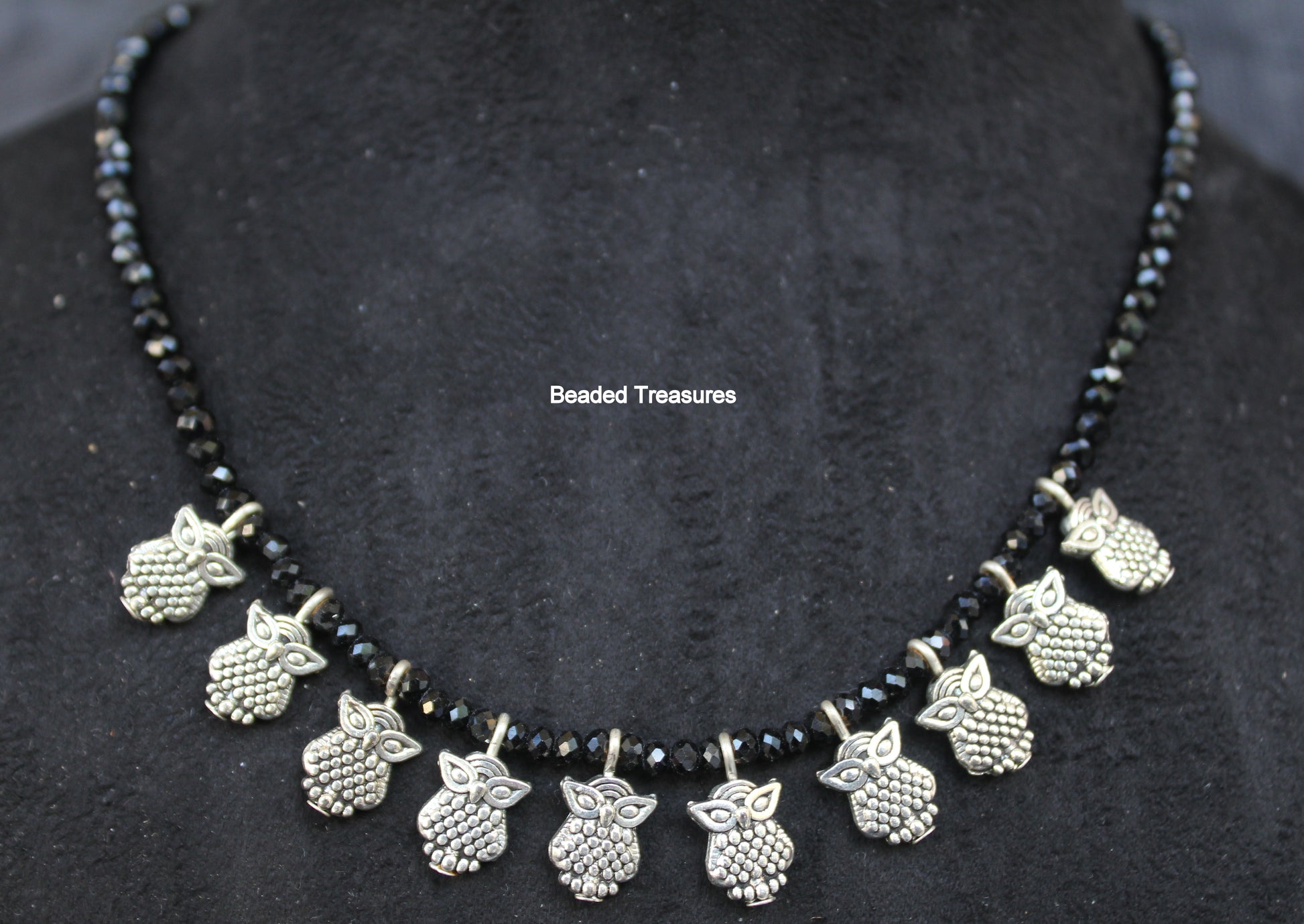 - Cute and whimsical Necklace featuring sparkling black beads and adorable oxidized German silver owl charms, handcrafted by Beaded Treasures in Bengaluru.