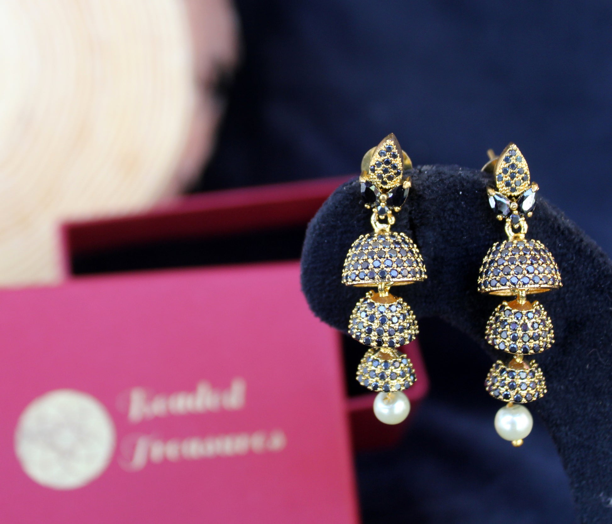 - Features a beautifully designed earring with a triangular top adorned with blue stones, leading to a tiered jhumka dome also encrusted with blue stones, and a delicate pearl drop.
