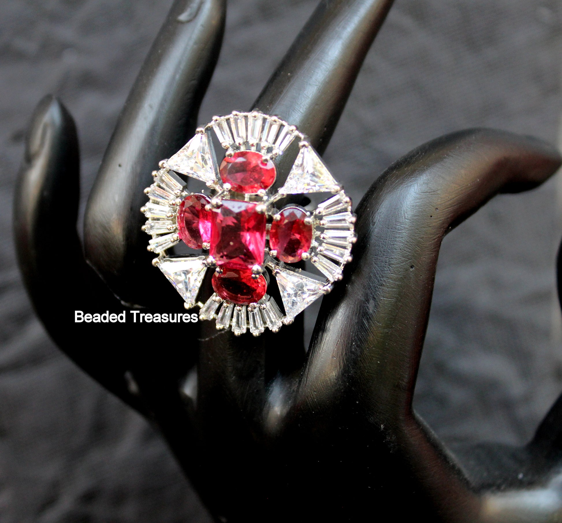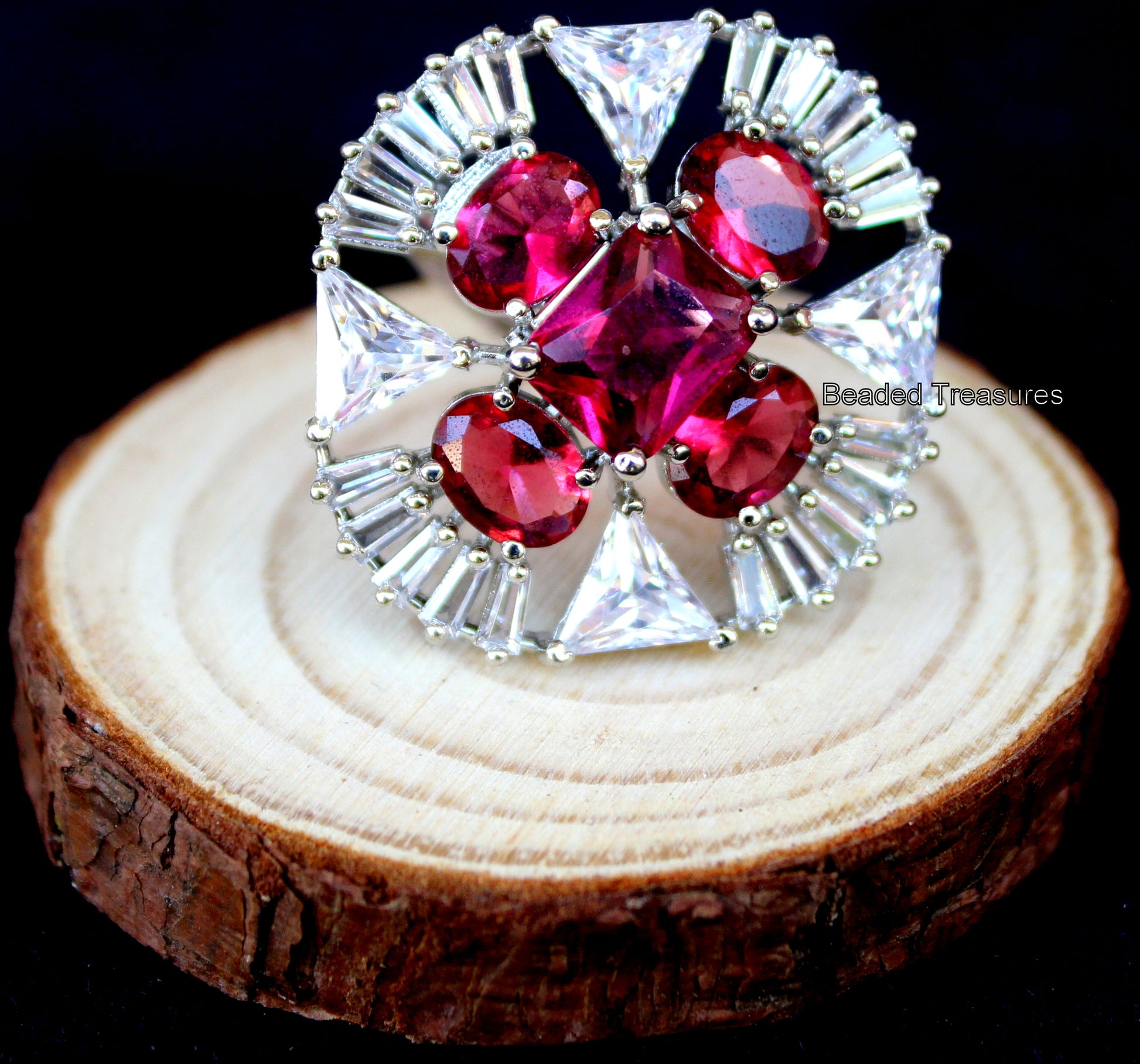 - Striking Rhodium Plated Finger Ring featuring sparkling Cubic Zirconia (CZ) stones and rich ruby-colored stones, handcrafted by Beaded Treasures in Bengaluru.