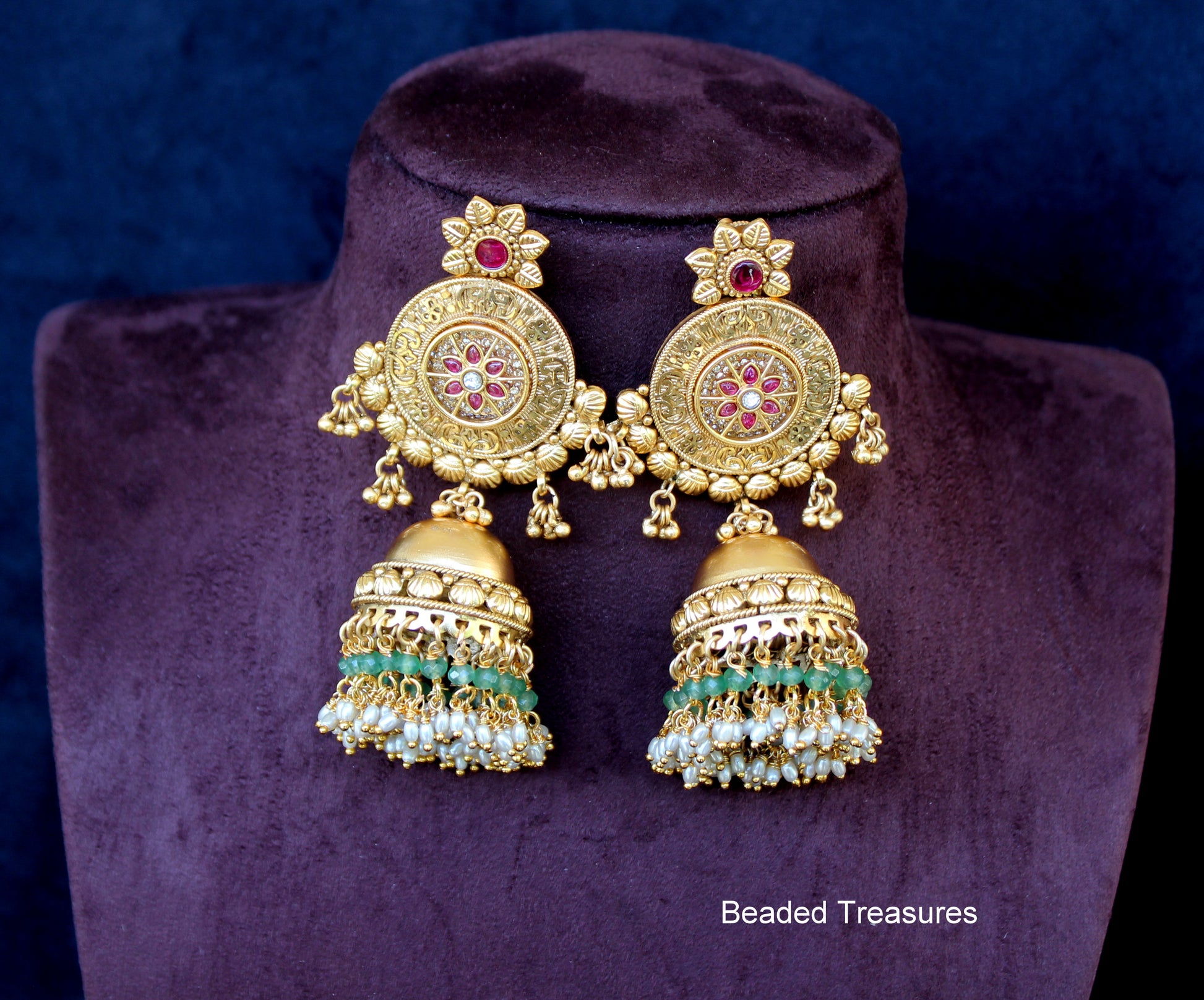 - The earrings showcase a blend of traditional South Indian temple jewelry design.