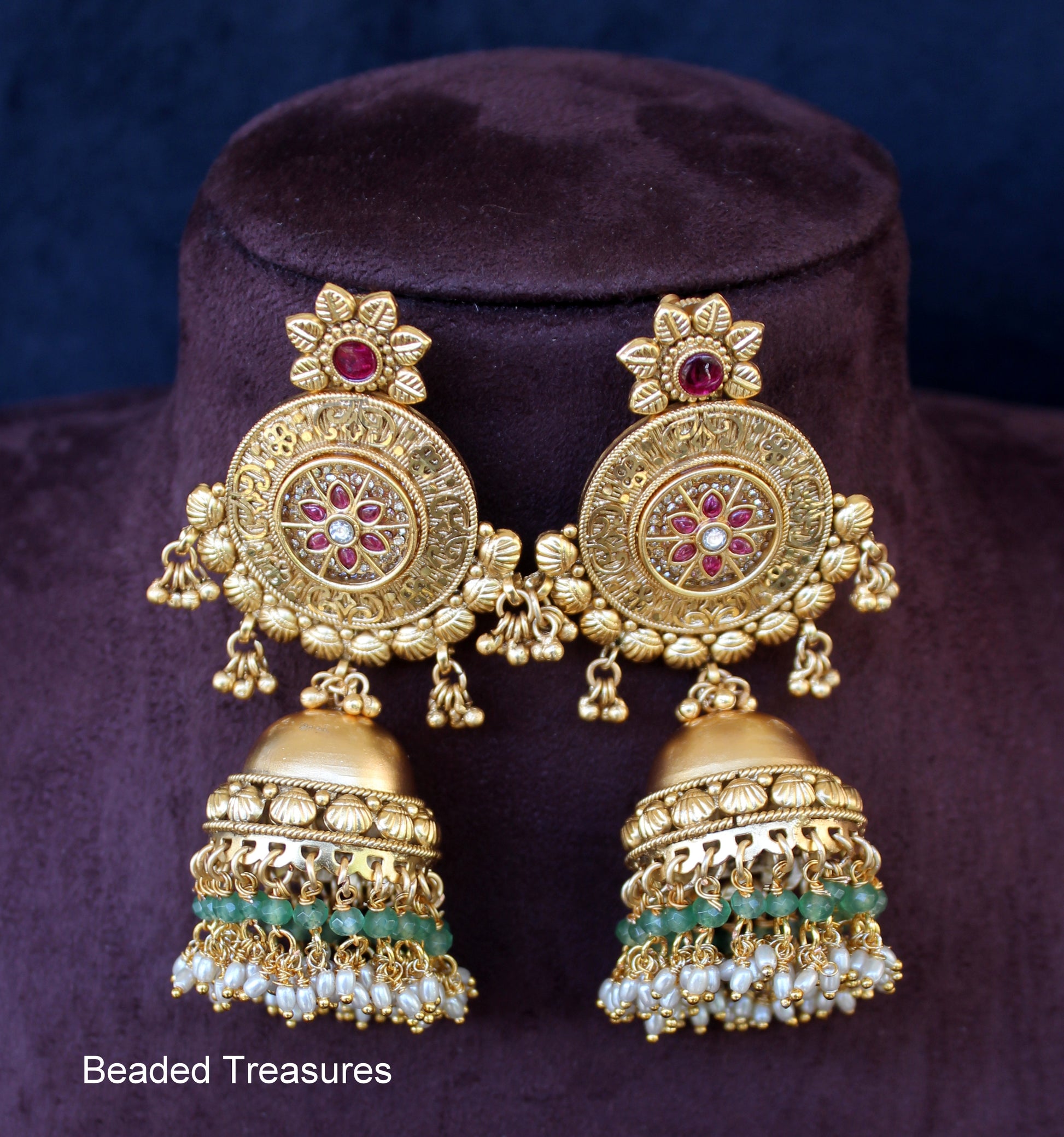 - Features a beautiful design with intricate golden brass work, ruby-like stone accents, and detailed jhumki bells with green stone and pearl drops.