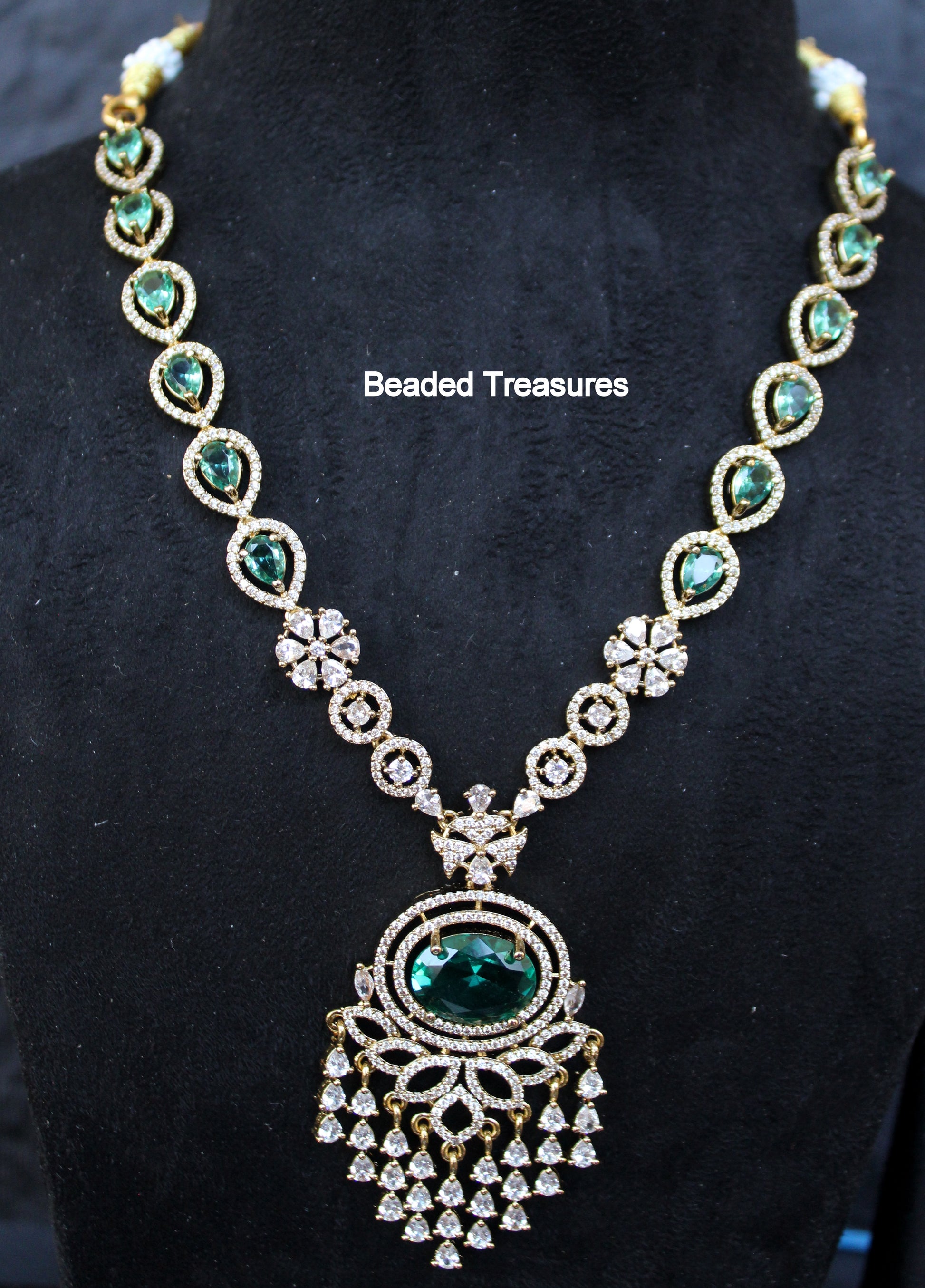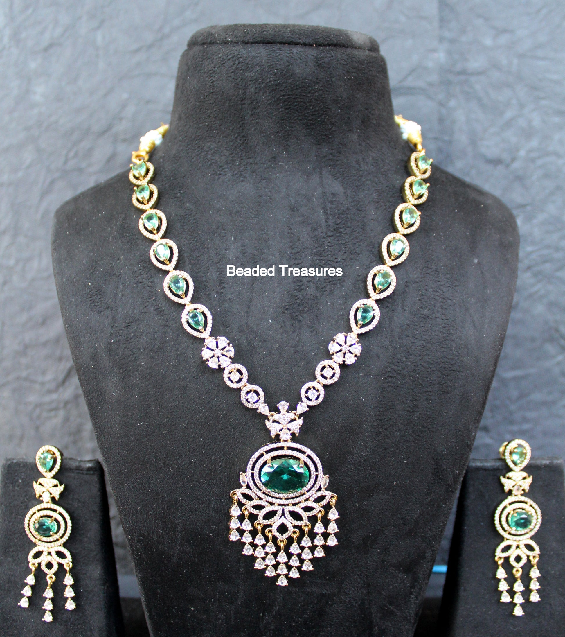 - Dazzling Necklace Set featuring sparkling American Diamond (AD) stones and a striking oval emerald green pendant, paired with matching earrings, handcrafted by Beaded Treasures in Bengaluru.