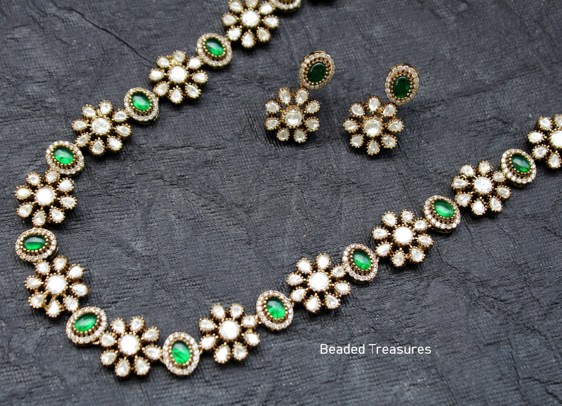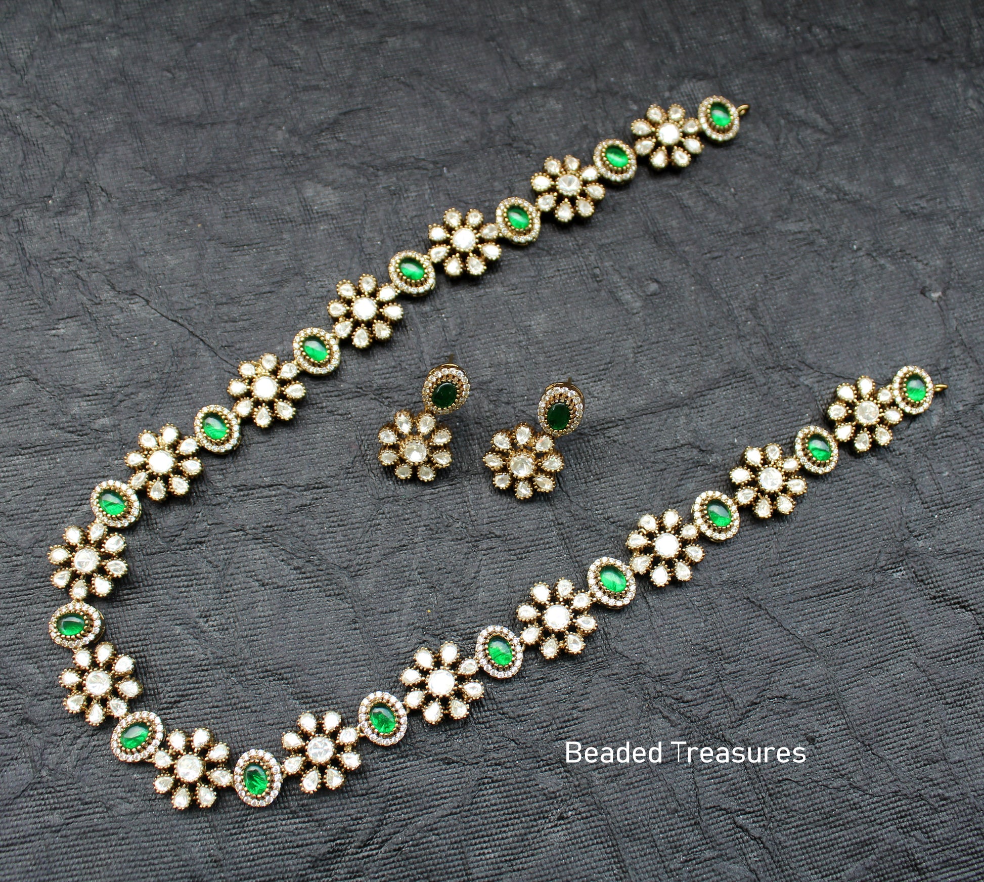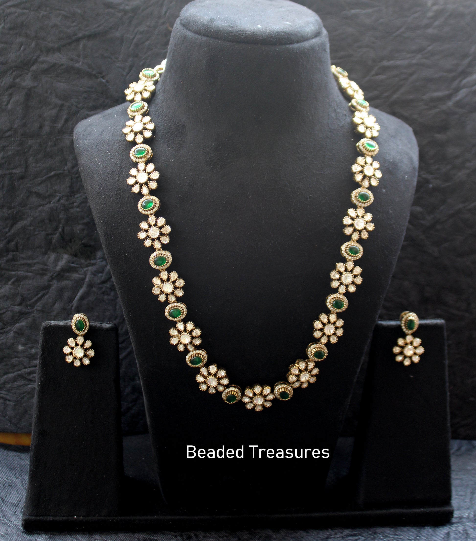 - This stunning set features a long, intricately designed necklace made with sparkling Kundan stones and vibrant green stone accents, set in a beautiful floral or paisley pattern.