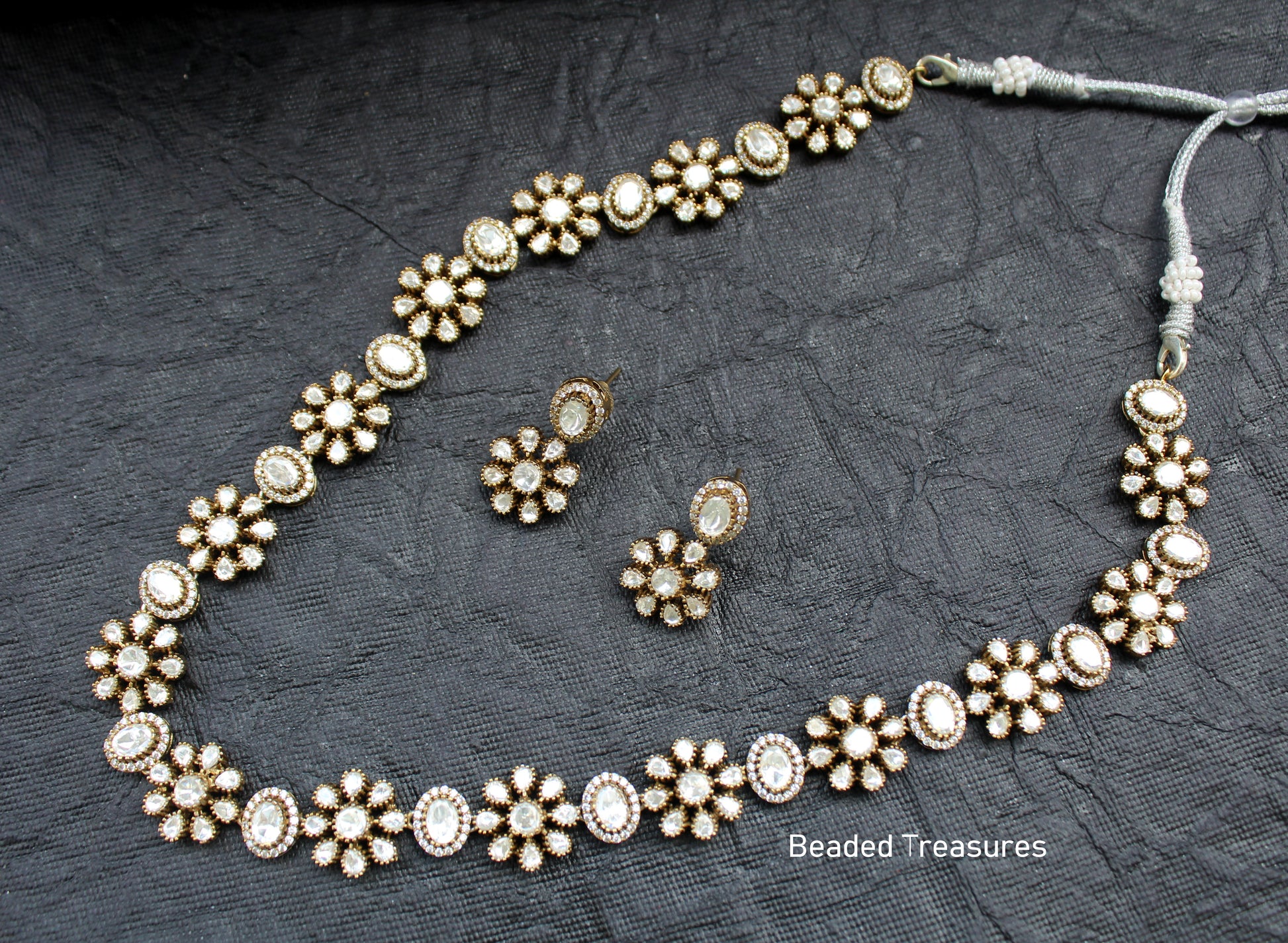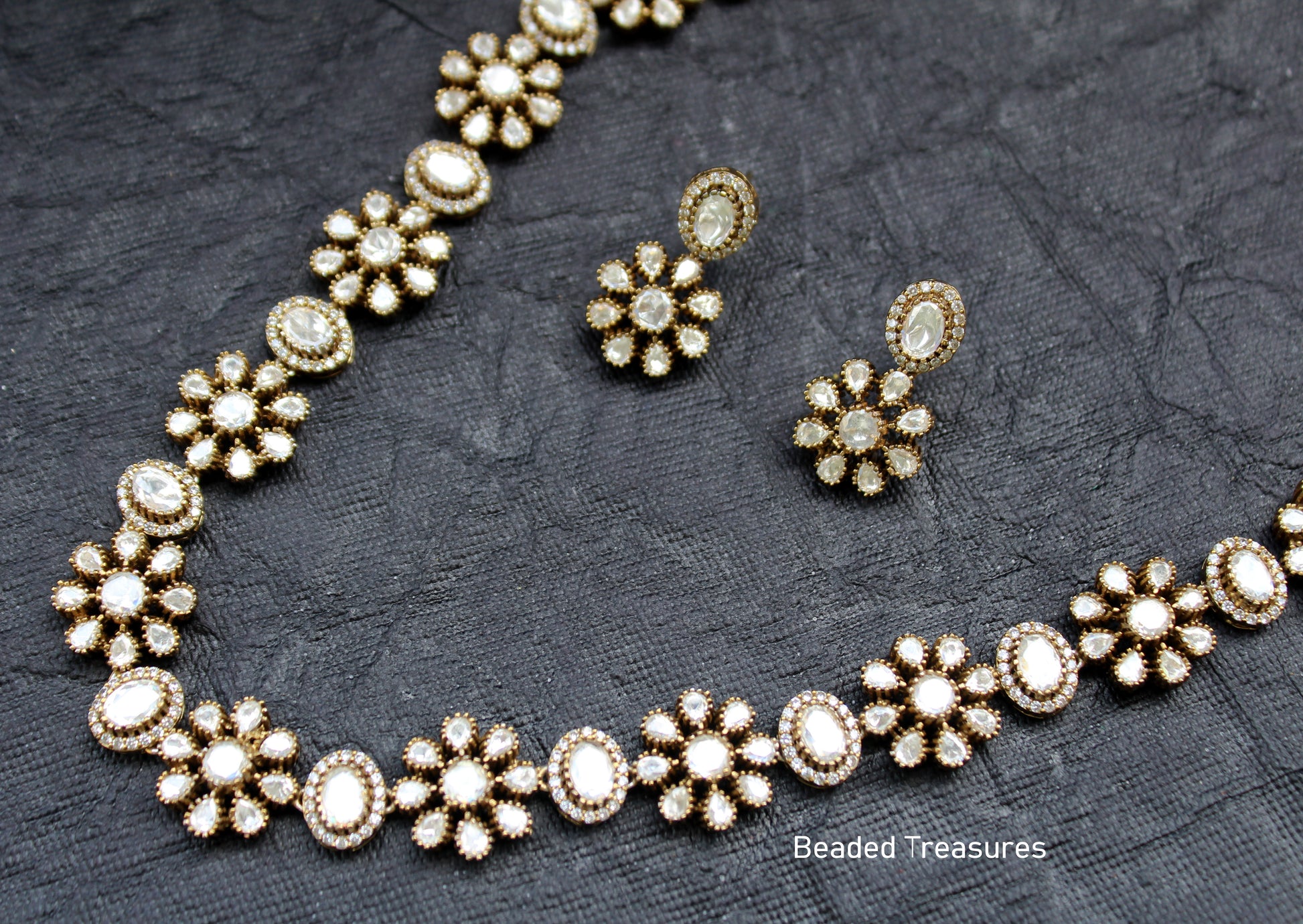 - The matching stud earrings echo the necklace's design, featuring the same beautiful setting of Moissanite Polki stones.
