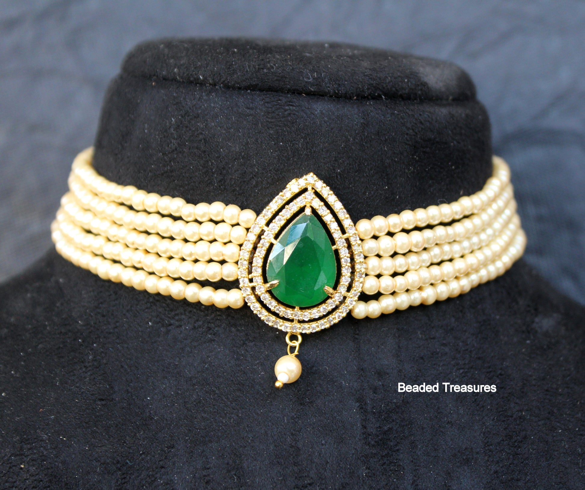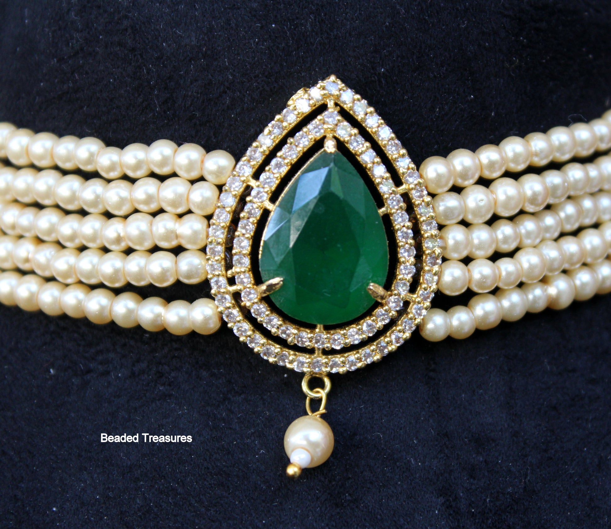 - Exquisite Multi-Strand Pearl Choker featuring a stunning green stone pendant adorned with sparkling accents, handcrafted by Beaded Treasures in Bengaluru.