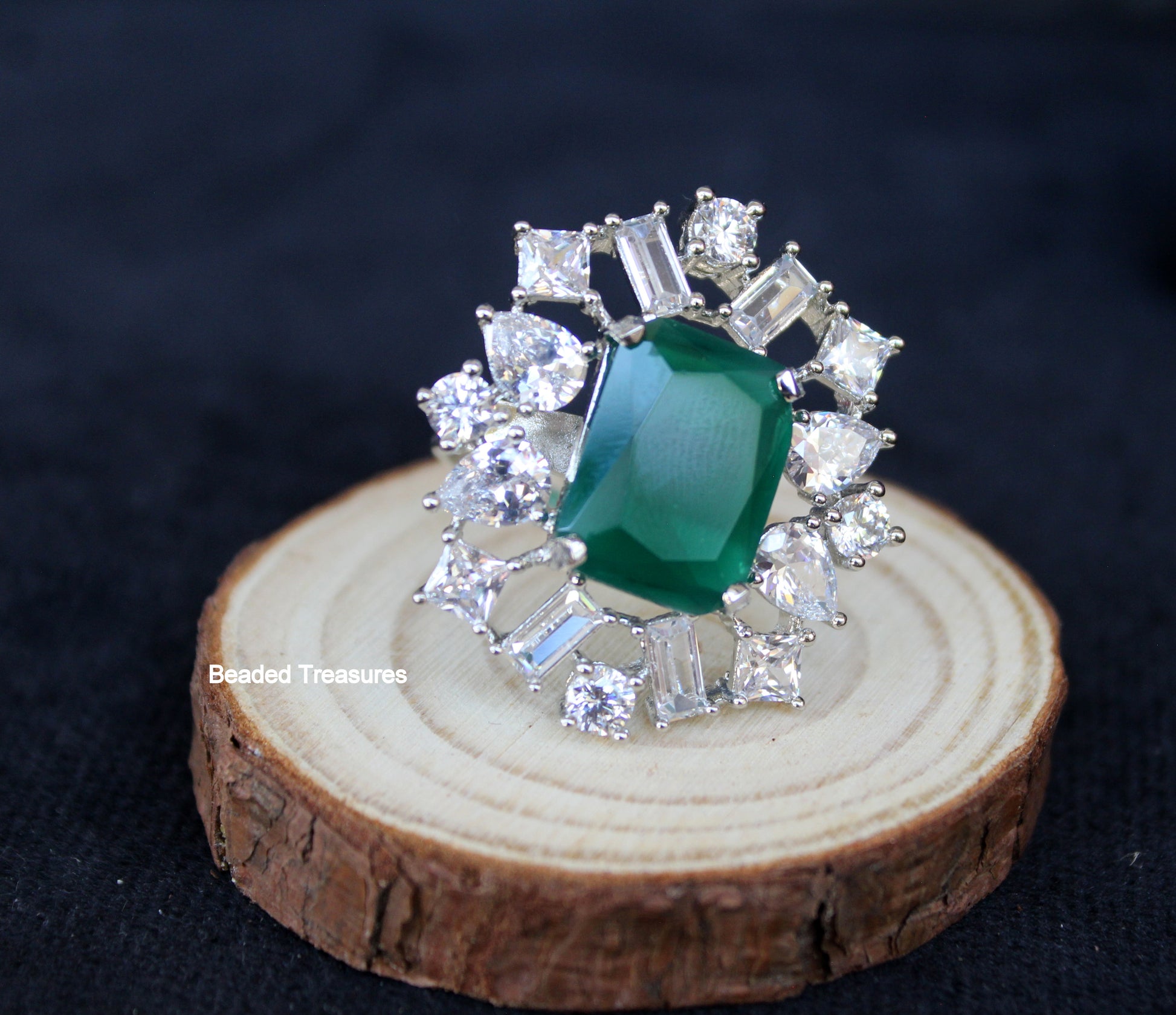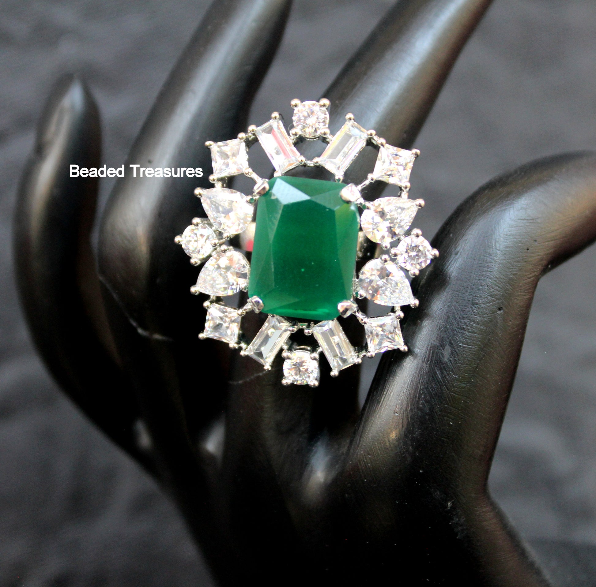 - Exquisite Rhodium Plated Finger Ring featuring a stunning emerald green center stone and sparkling Cubic Zirconia (CZ) accents, handcrafted by Beaded Treasures in Bengaluru.