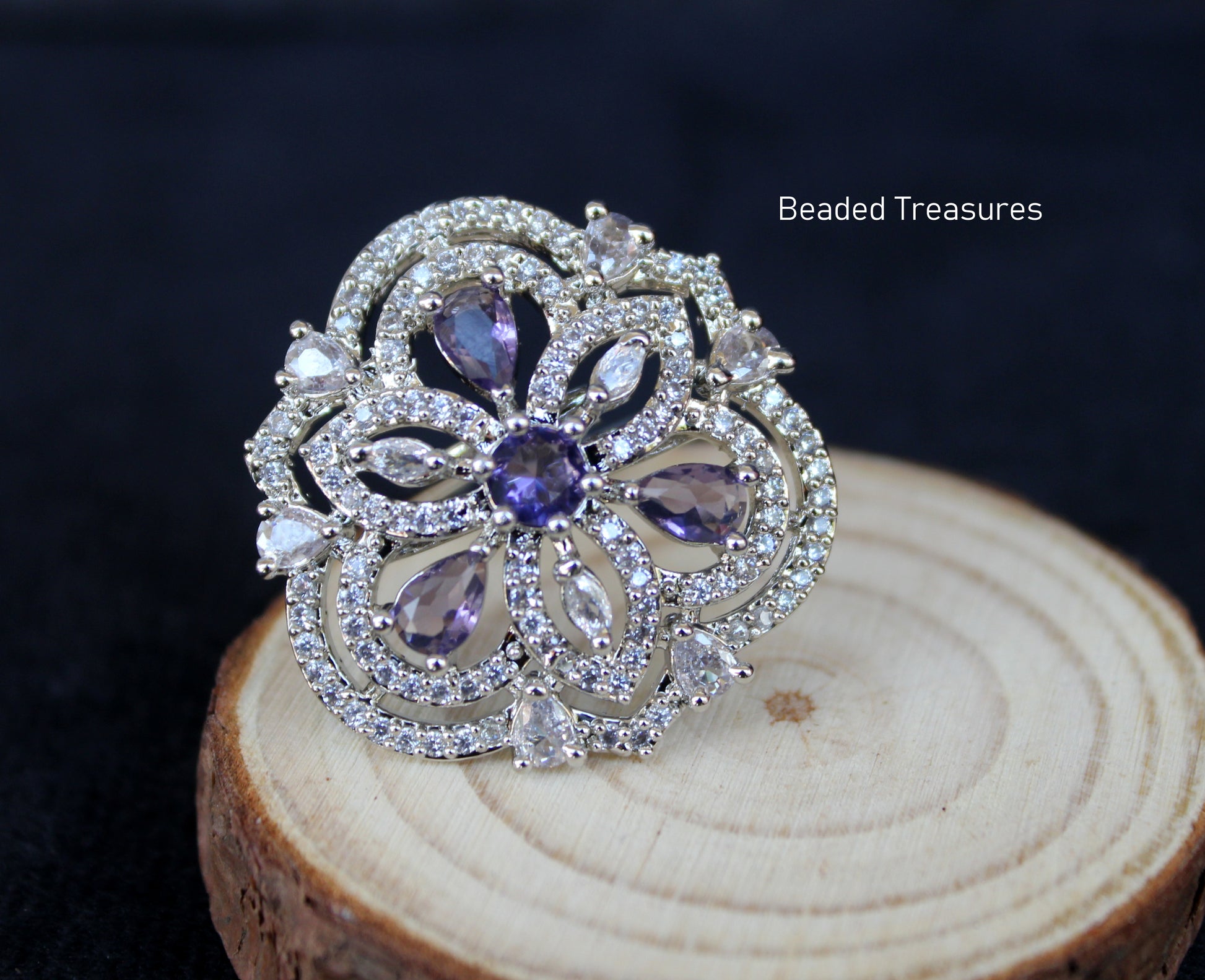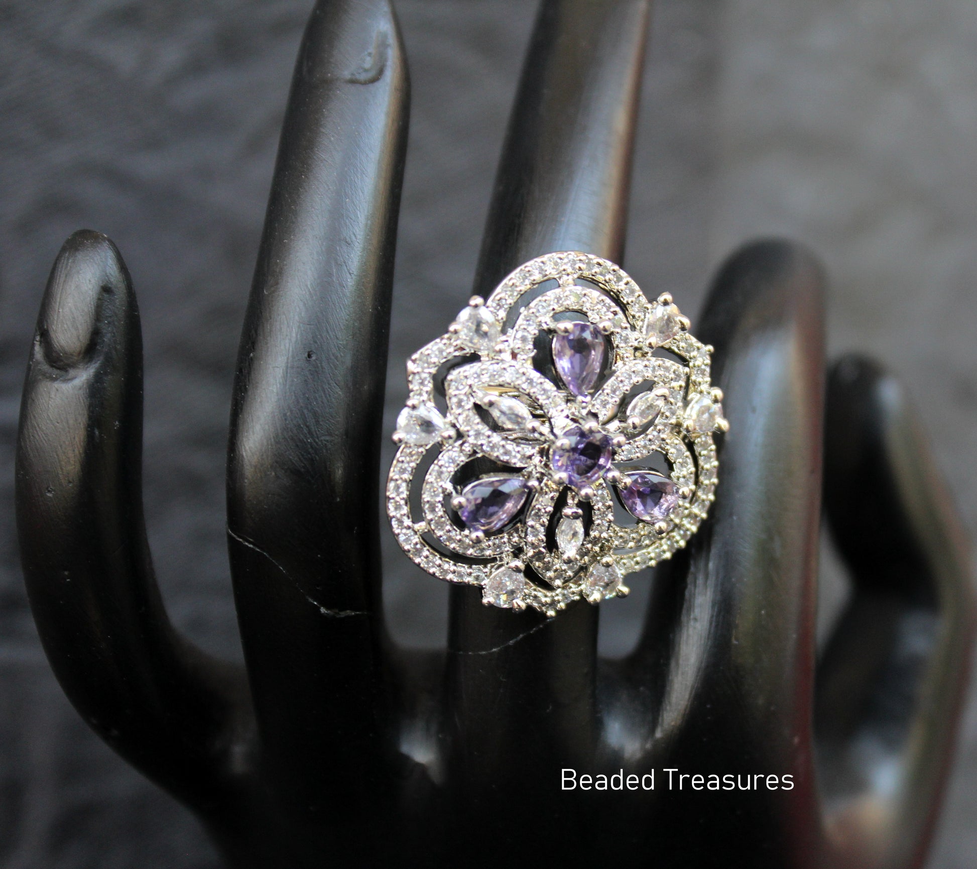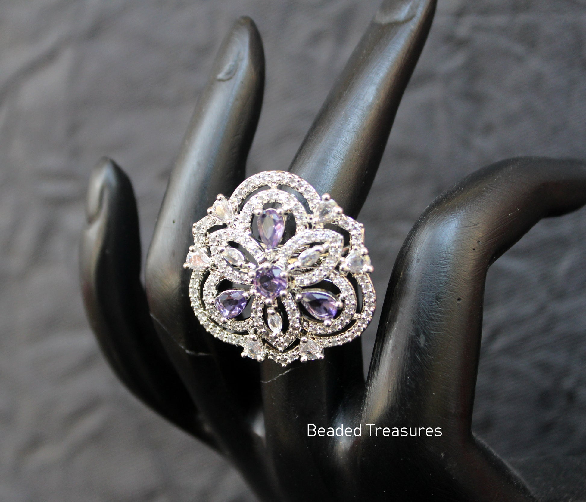 - Exquisite Rhodium Plated Finger Ring featuring a classic and intricate design adorned with sparkling Cubic Zirconia (CZ) stones and beautiful purple accents, handcrafted by Beaded Treasures in Bengaluru.
