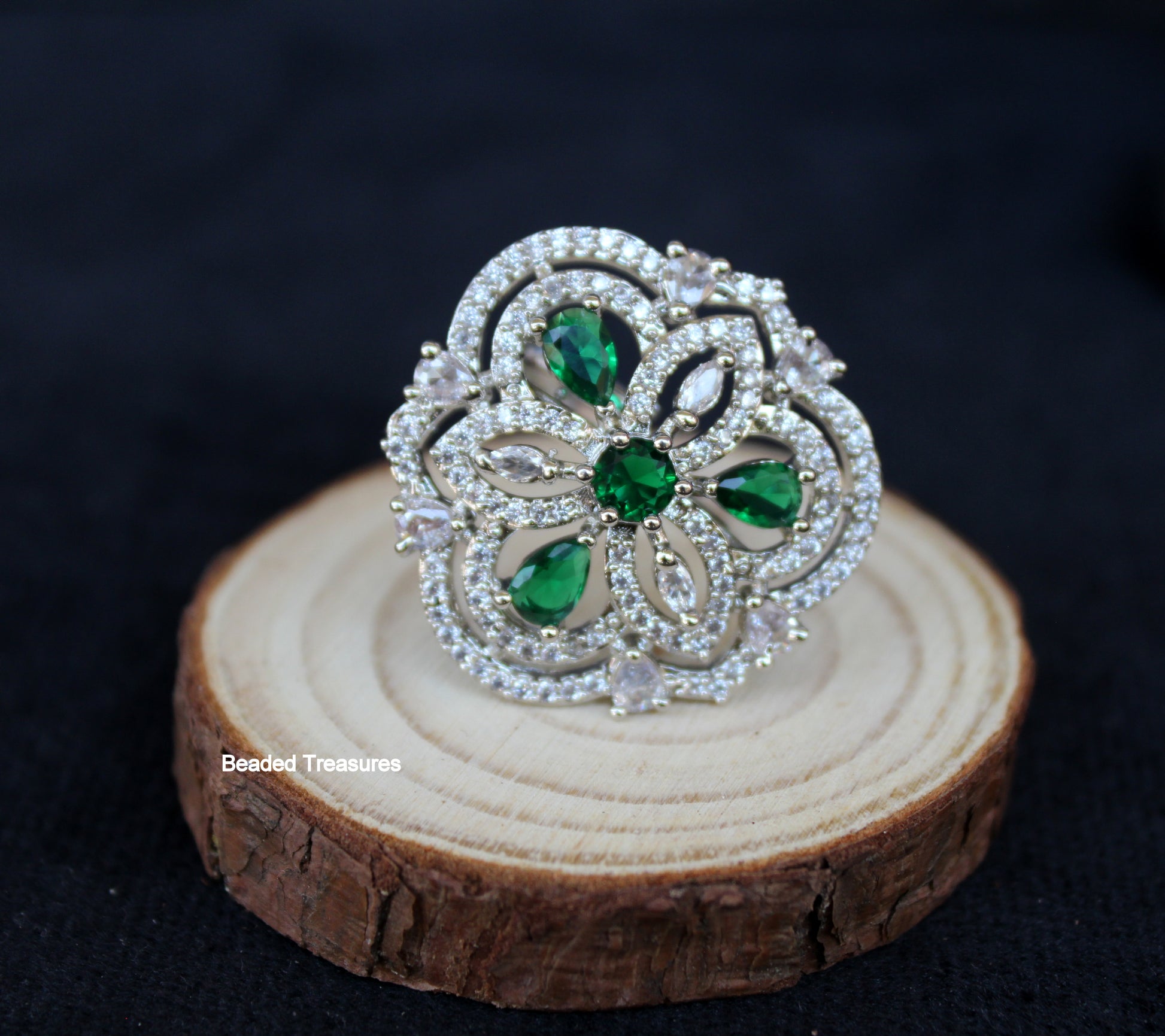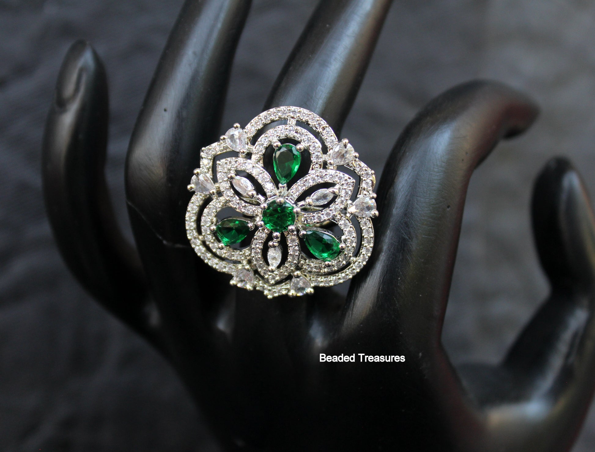 - Exquisite Rhodium Plated Finger Ring featuring sparkling Cubic Zirconia (CZ) stones and beautiful green stones, handcrafted by Beaded Treasures in Bengaluru.
