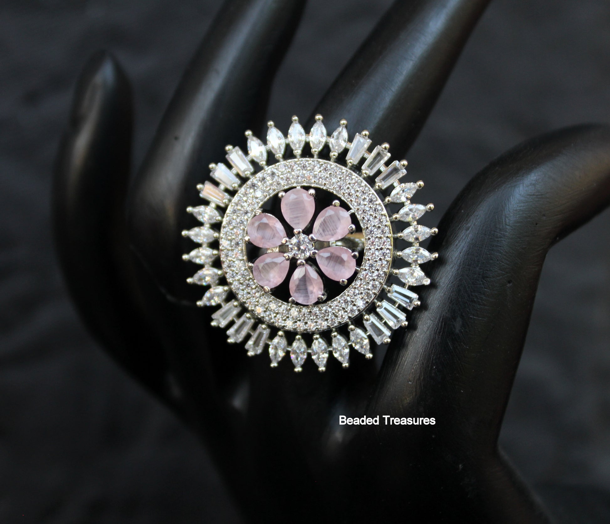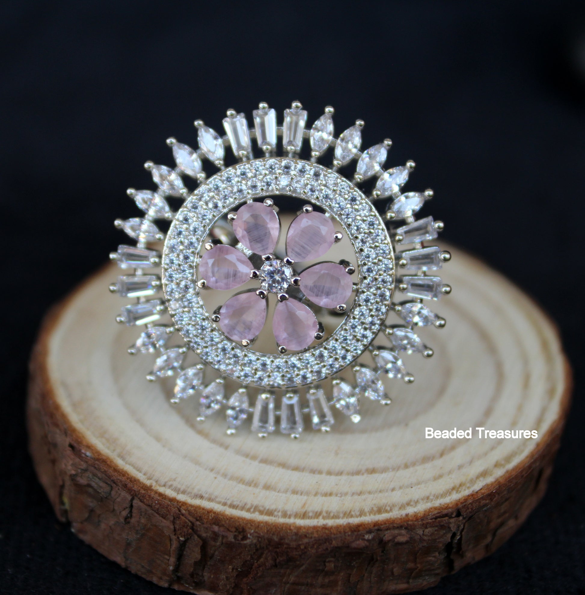 - Exquisite Rhodium Plated Finger Ring featuring sparkling Cubic Zirconia (CZ) stones and delicate light pink stones, handcrafted by Beaded Treasures in Bengaluru.