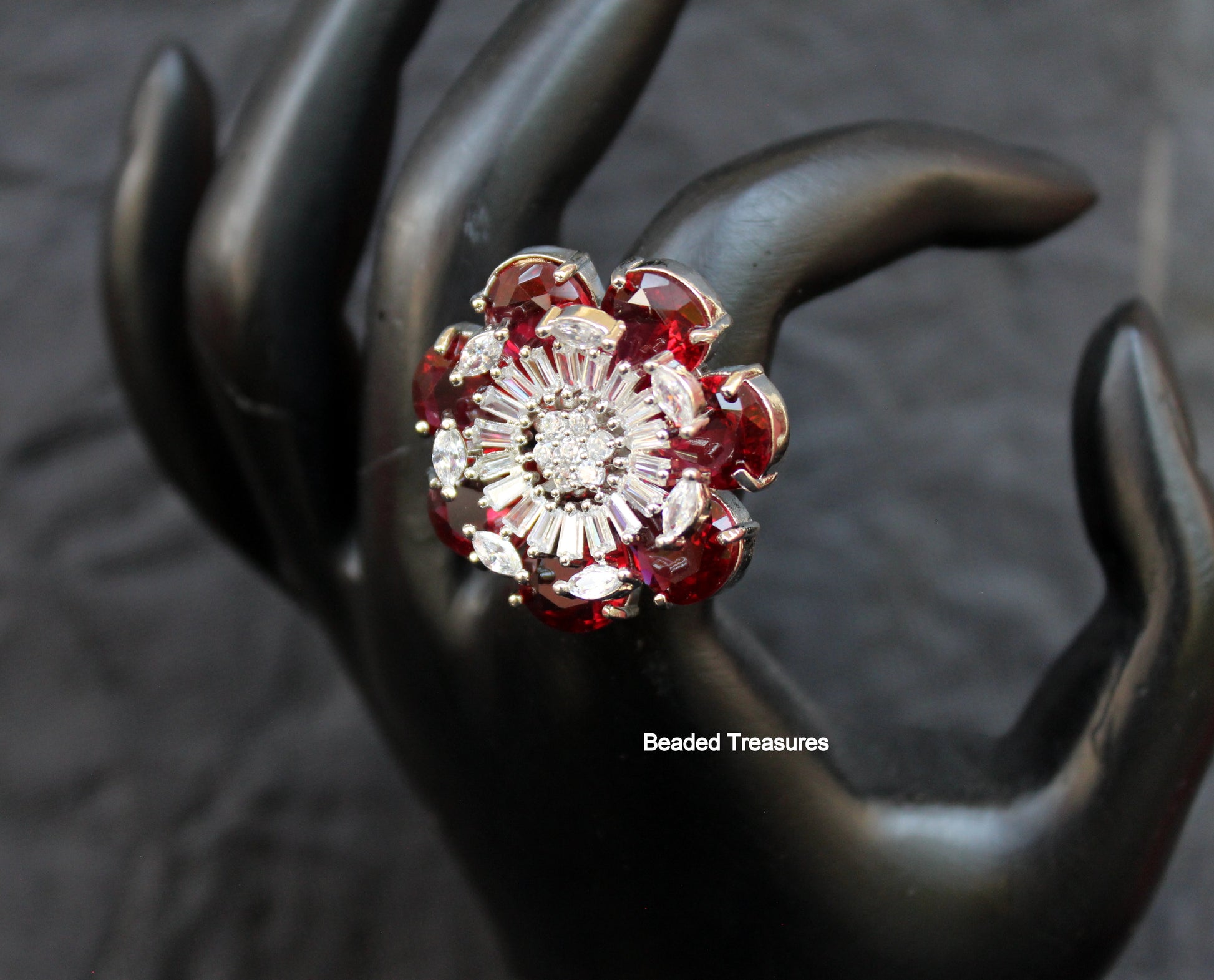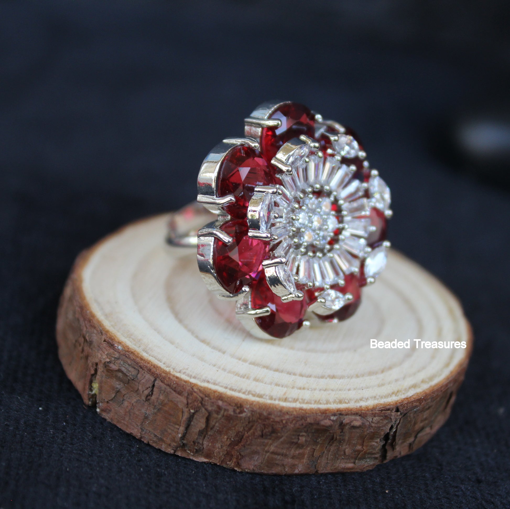 - Exquisite Rhodium Plated Finger Ring featuring sparkling Cubic Zirconia (CZ) stones and rich ruby-colored stones, handcrafted by Beaded Treasures in Bengaluru.