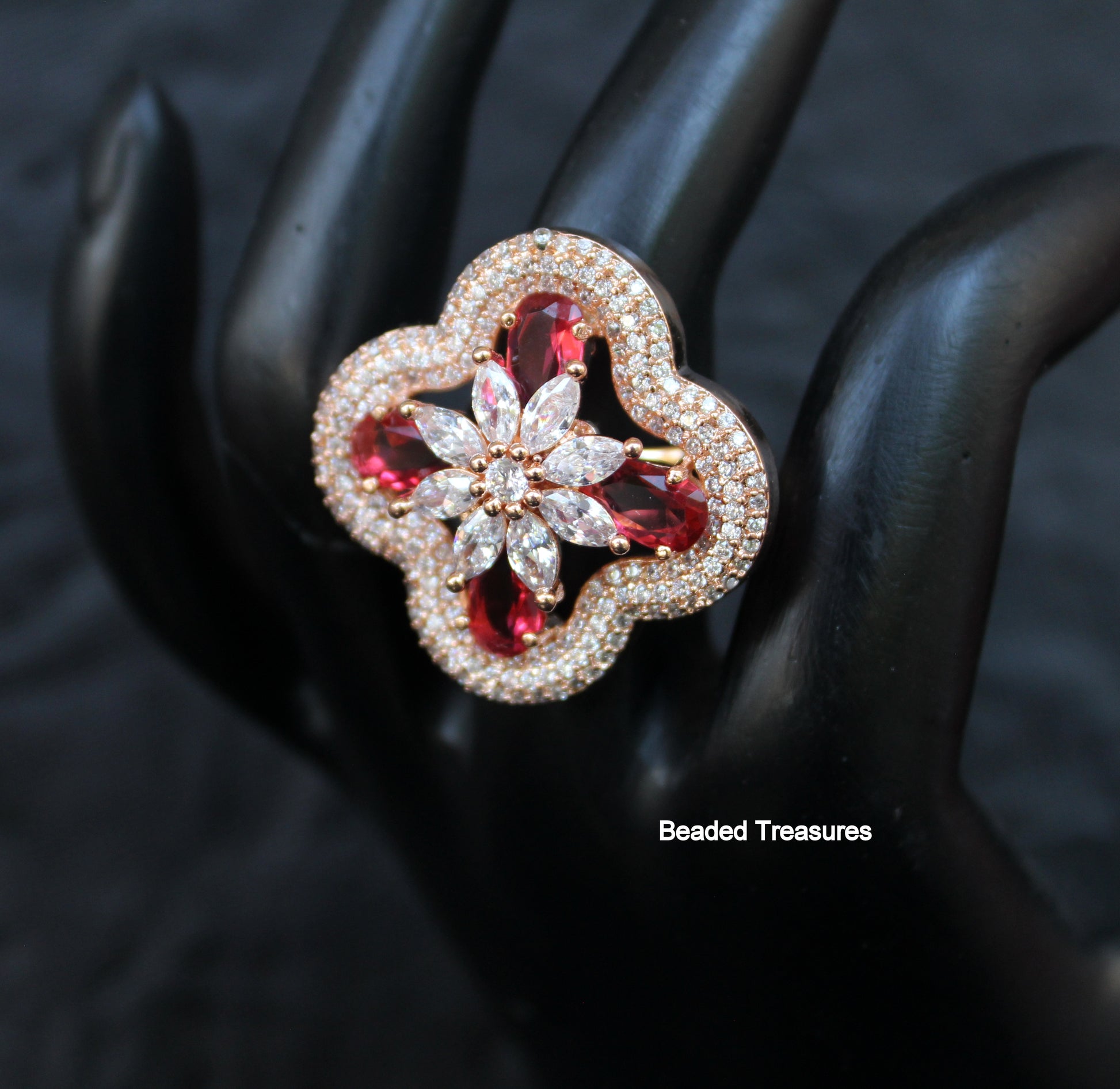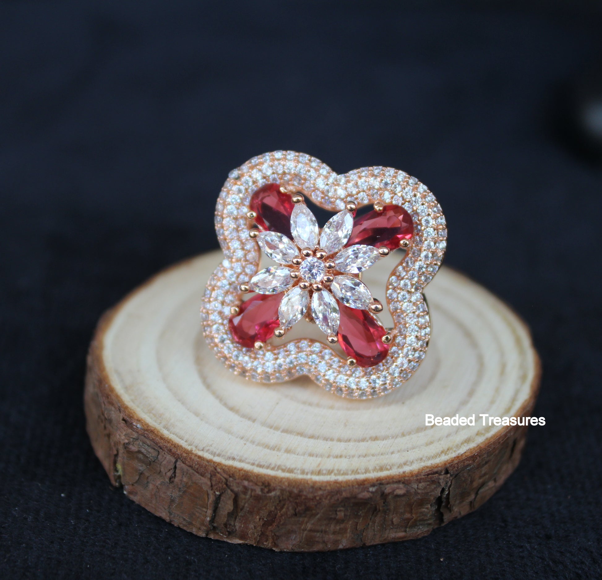 - Exquisite Rose Gold Plated Finger Ring featuring sparkling Cubic Zirconia (CZ) stones and beautiful ruby-colored stones, handcrafted by Beaded Treasures in Bengaluru.