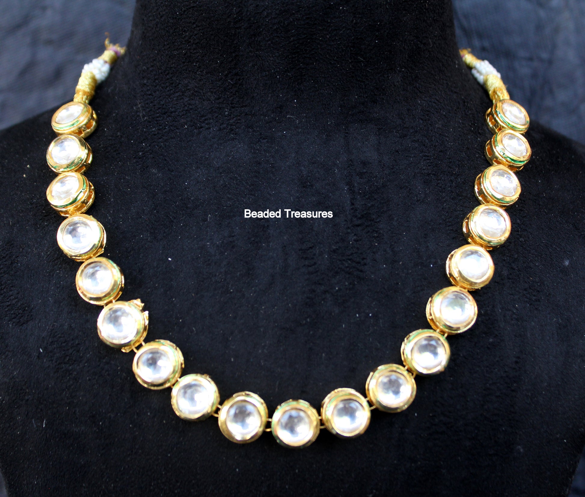 - This elegant necklace showcases a single strand of high-quality, round Kundan stones, each intricately set to reflect light beautifully and add a touch of traditional glamour.