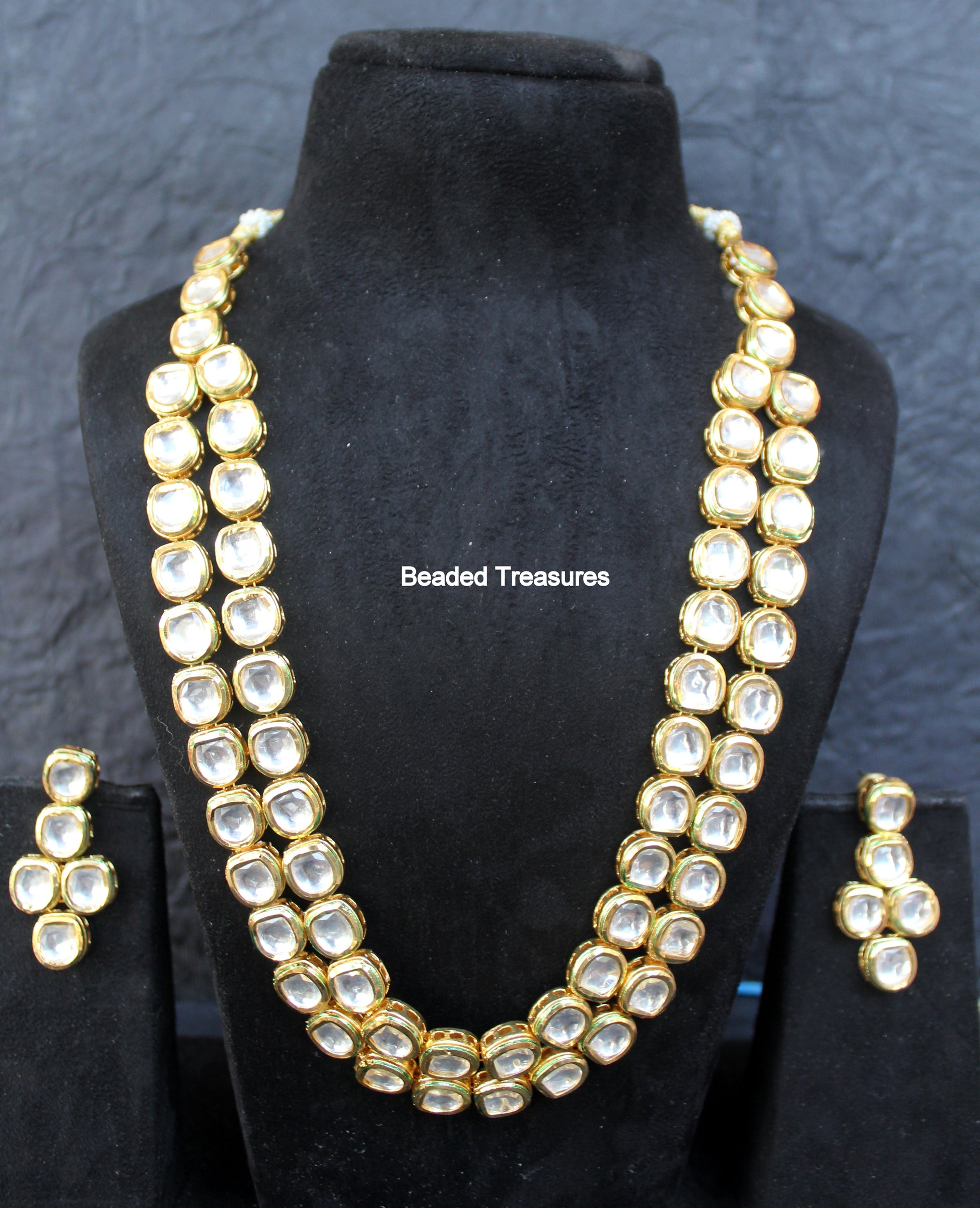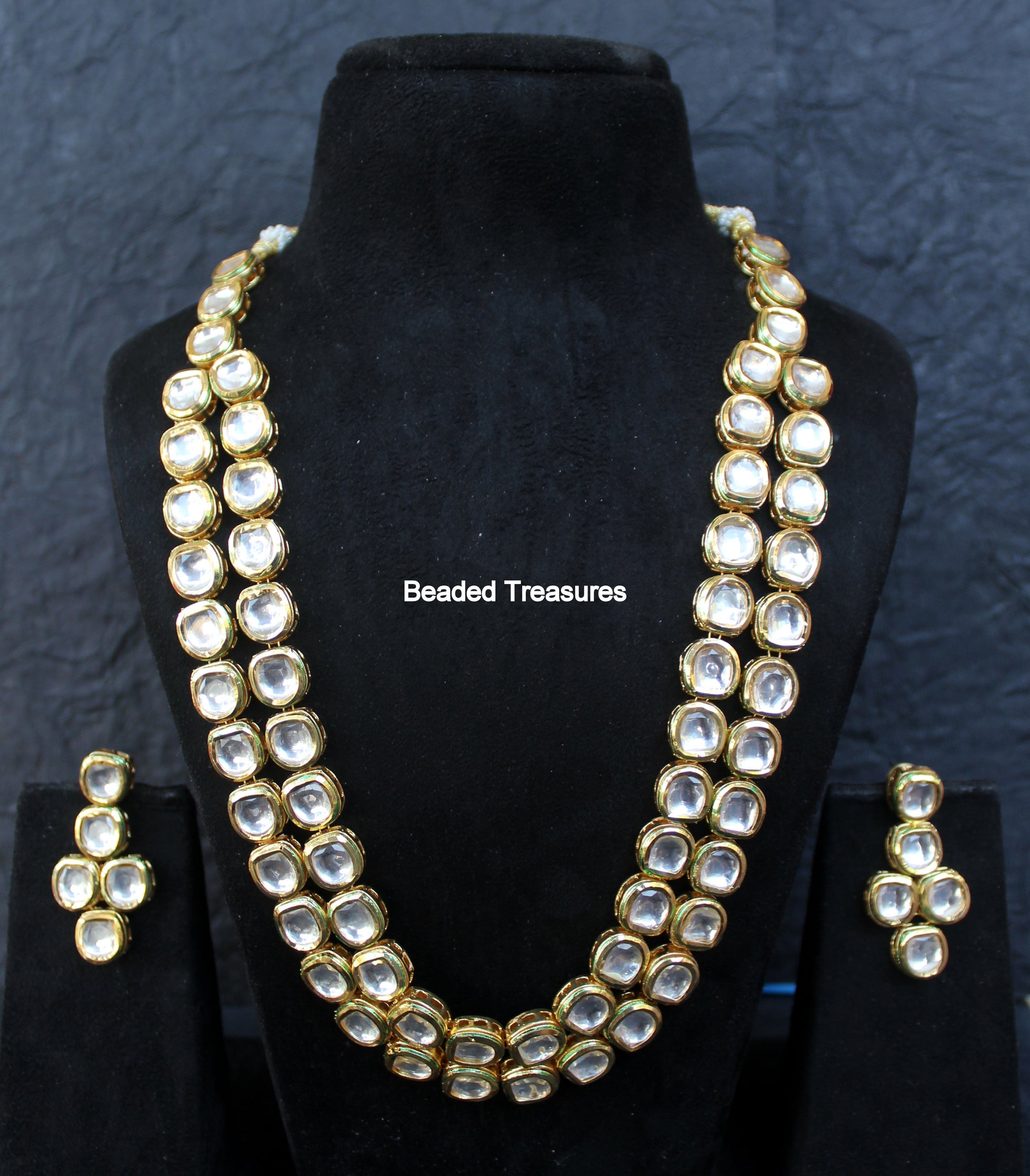 - Exquisite Two Layer Necklace Set featuring sparkling Kundan stones set in a beautiful gold-toned frame, paired with matching earrings, handcrafted by Beaded Treasures in Bengaluru.