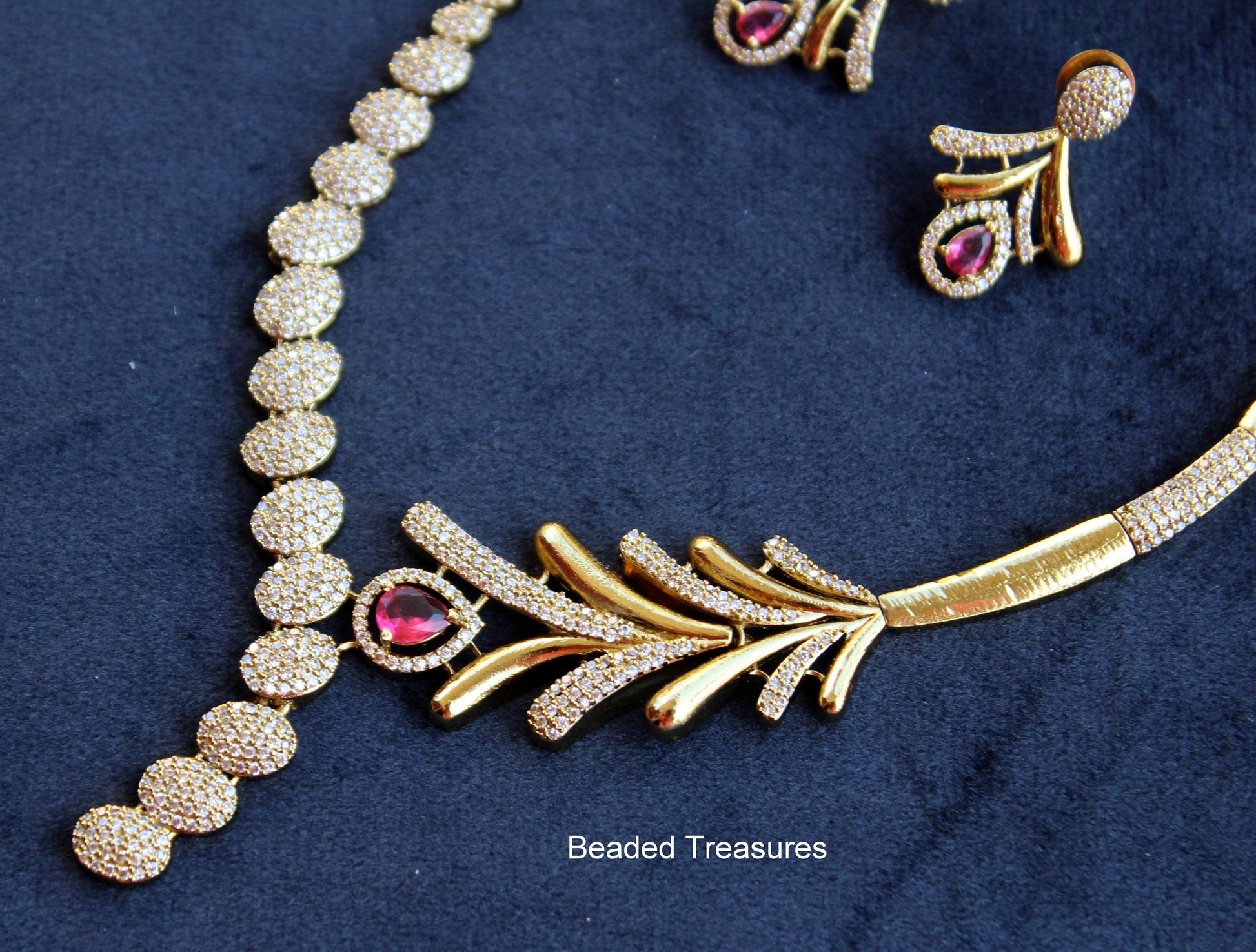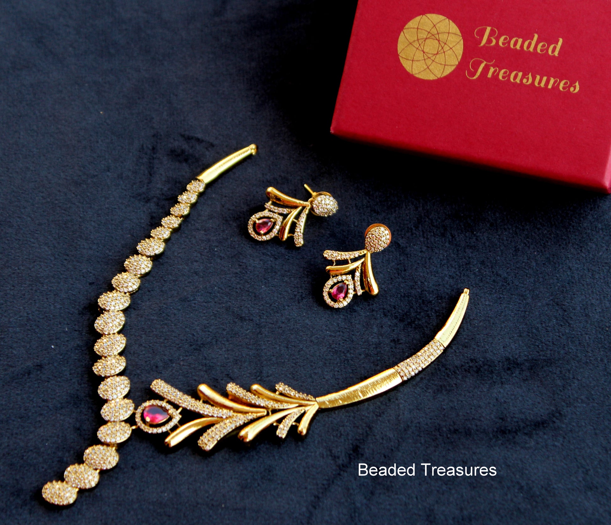 - Elegant Feather Design AD Necklace Set with Ruby Stone Accents, crafted by Beaded Treasures in Bengaluru.