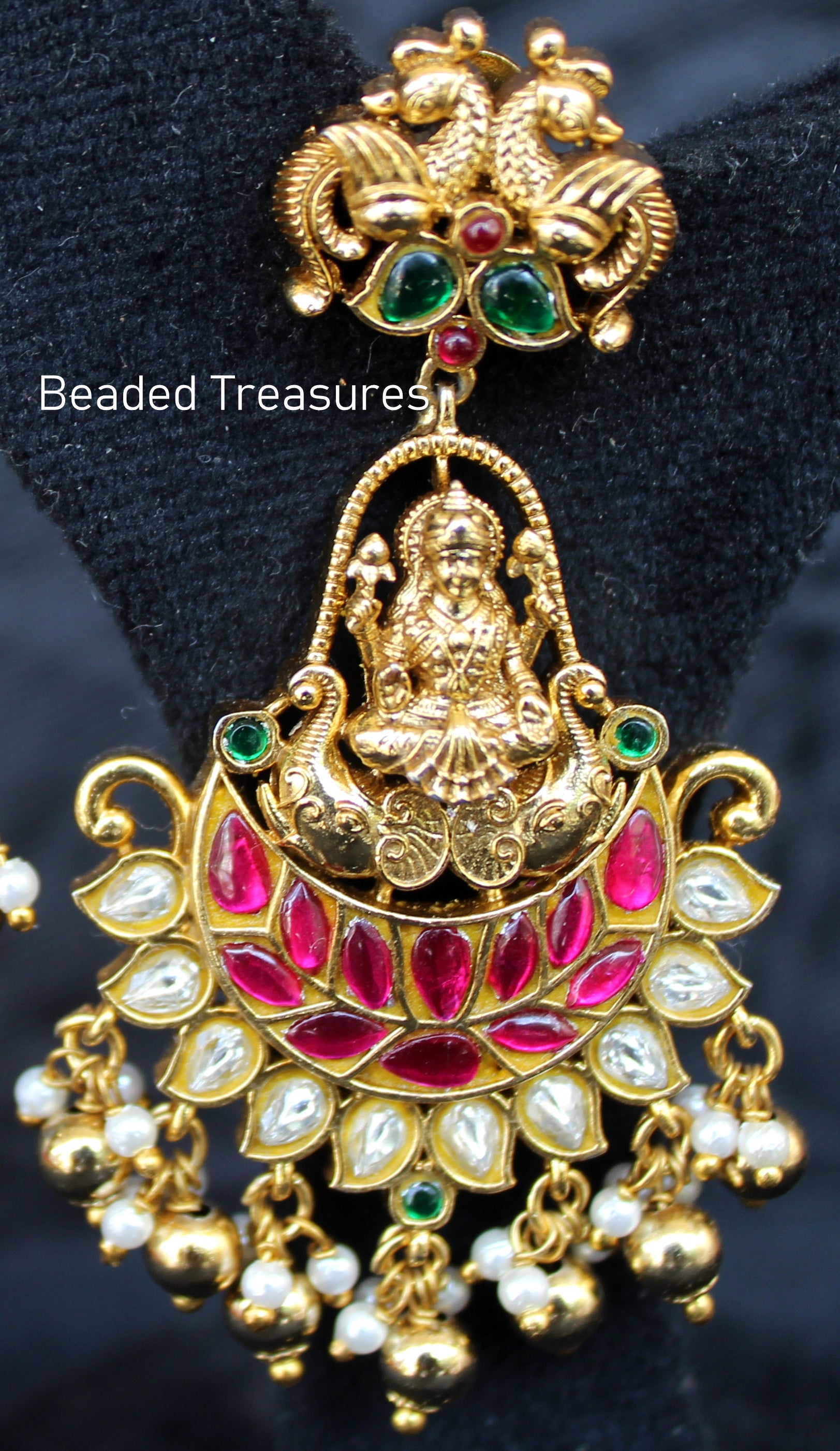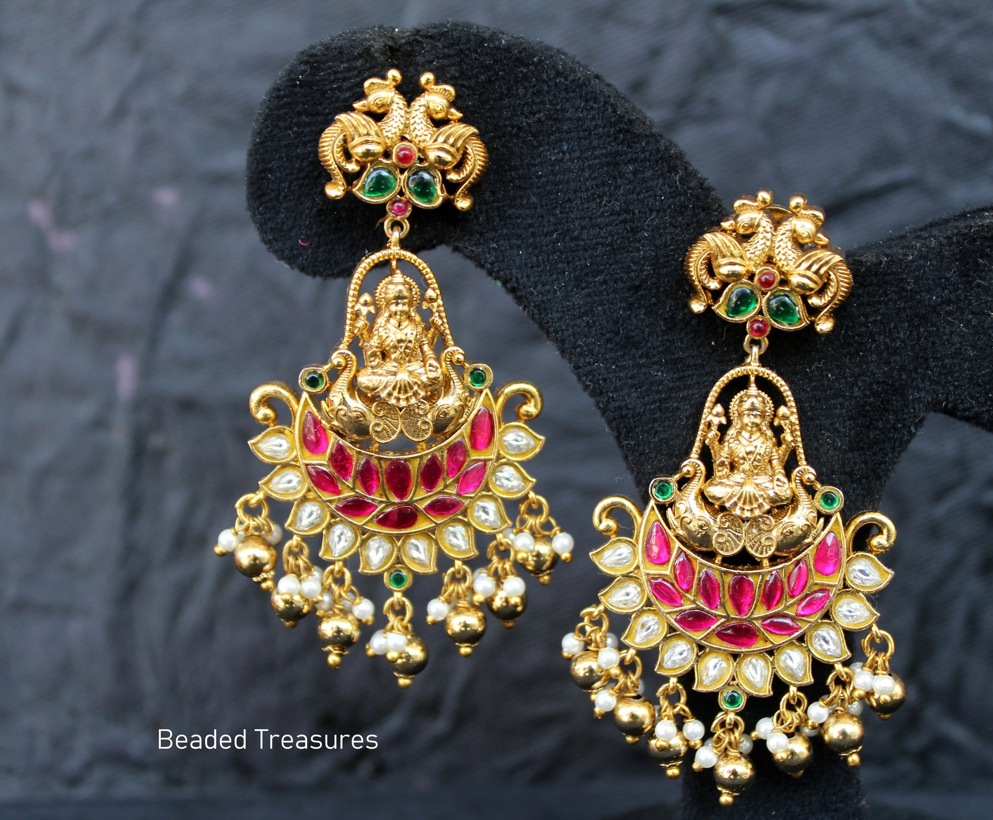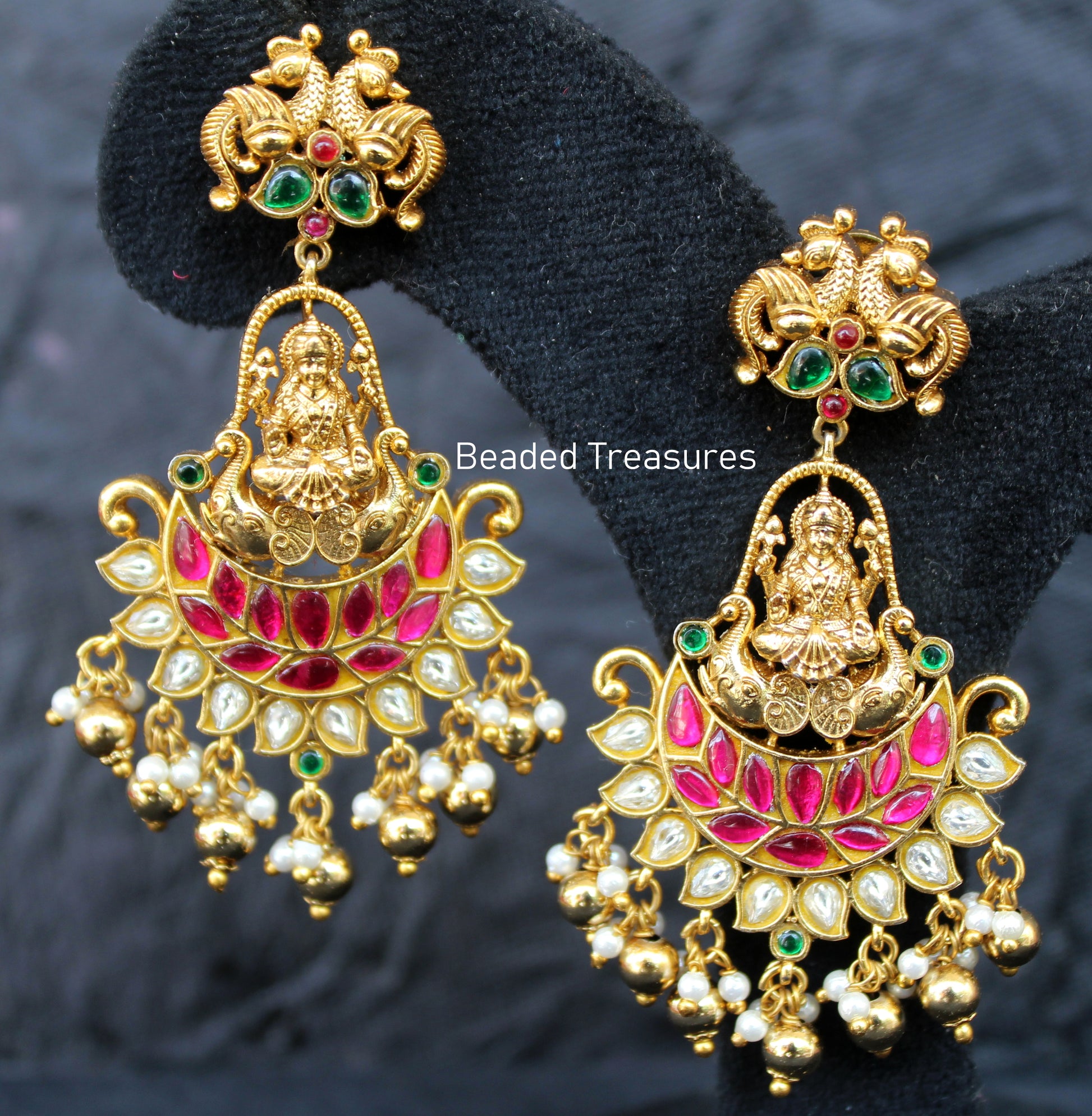 - Exquisite Antique Gold Finish Earrings featuring the auspicious Goddess Gaja Lakshmi, vibrant Kemp (ruby-like) and emerald-like stones, sparkling white stones (likely CZ), and delicate pearl drops, handcrafted by Beaded Treasures in Bengaluru.