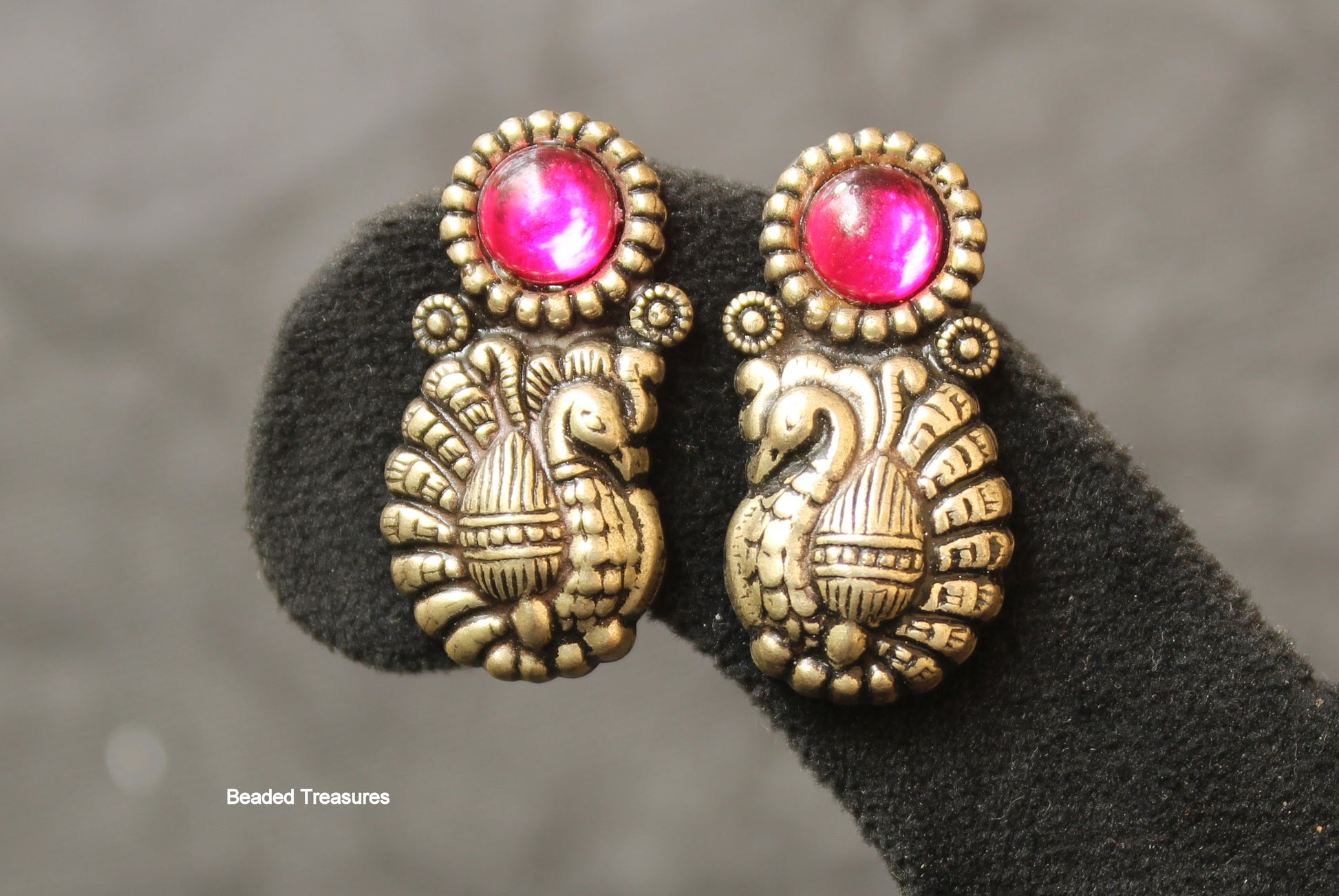 - Charming pair of stud earrings featuring intricately detailed oxidized German silver peacock motifs, each accented with a vibrant pink stone, handcrafted by Beaded Treasures in Bengaluru.