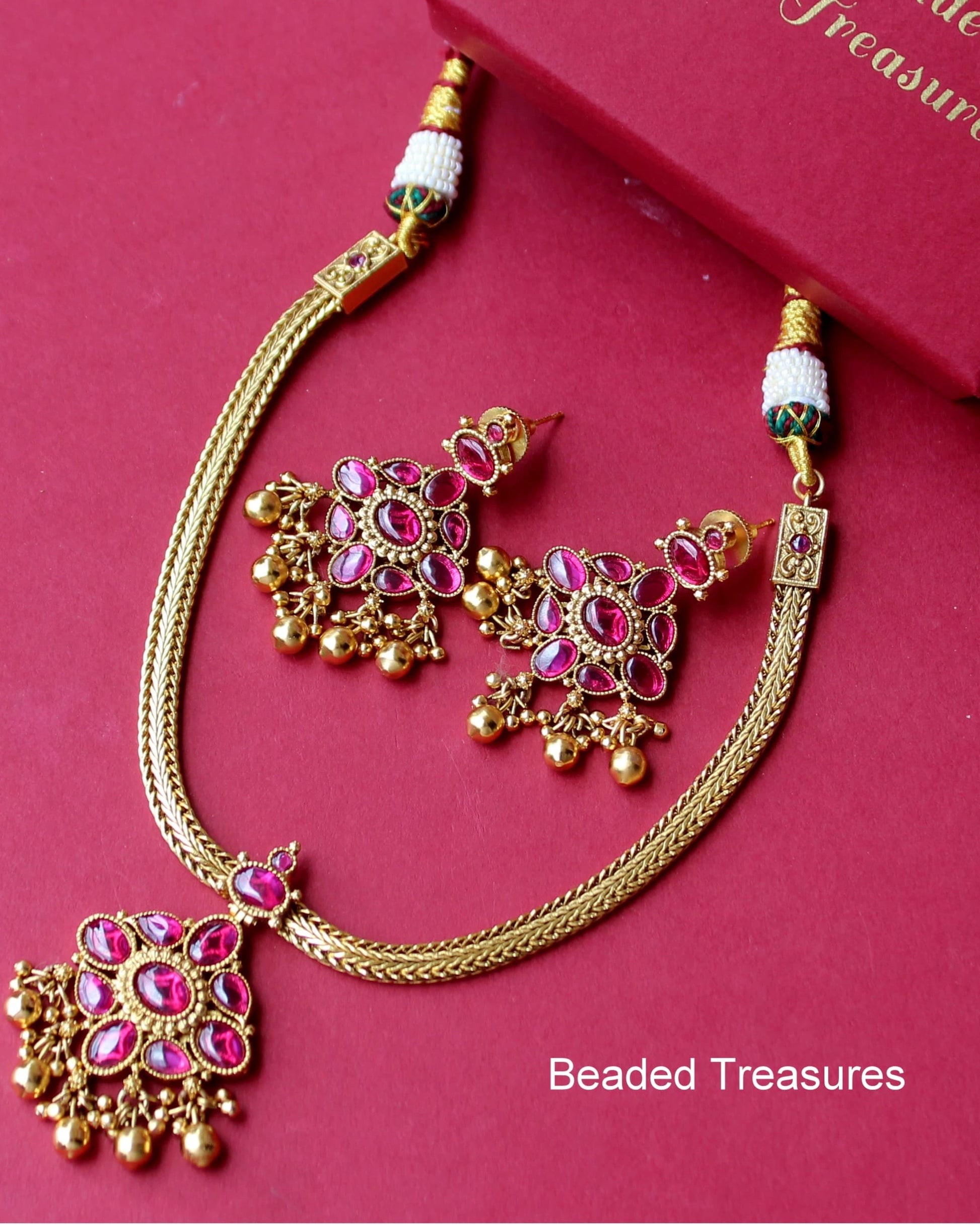 - Features a traditional design with vibrant Kempu stones set in a Gheru finish.