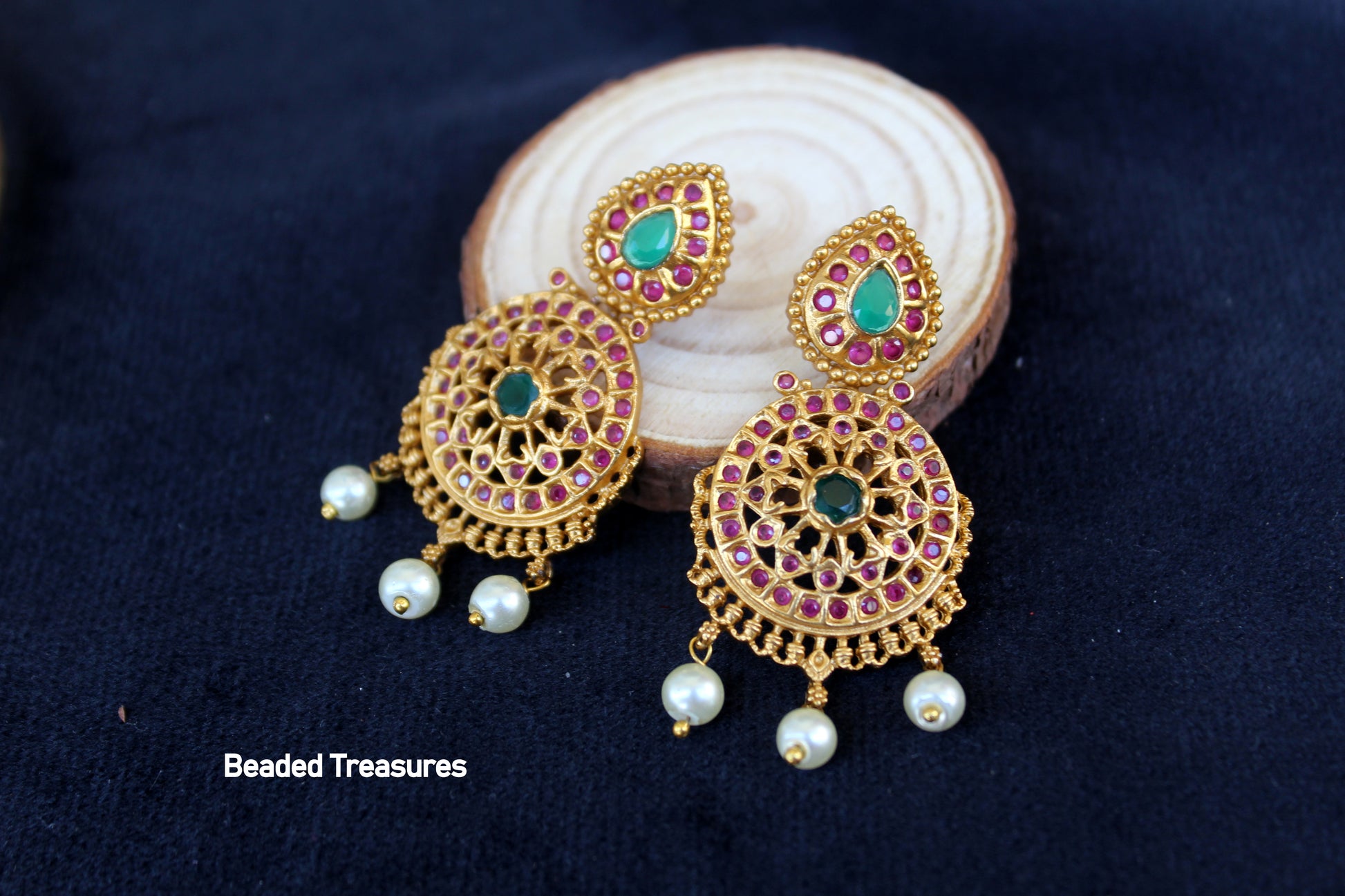 - Exquisite Gold Plated 925 Silver Ruby and Emerald Antique Finish Reversible Pendant Earrings, handcrafted by Beaded Treasures in Bengaluru.
