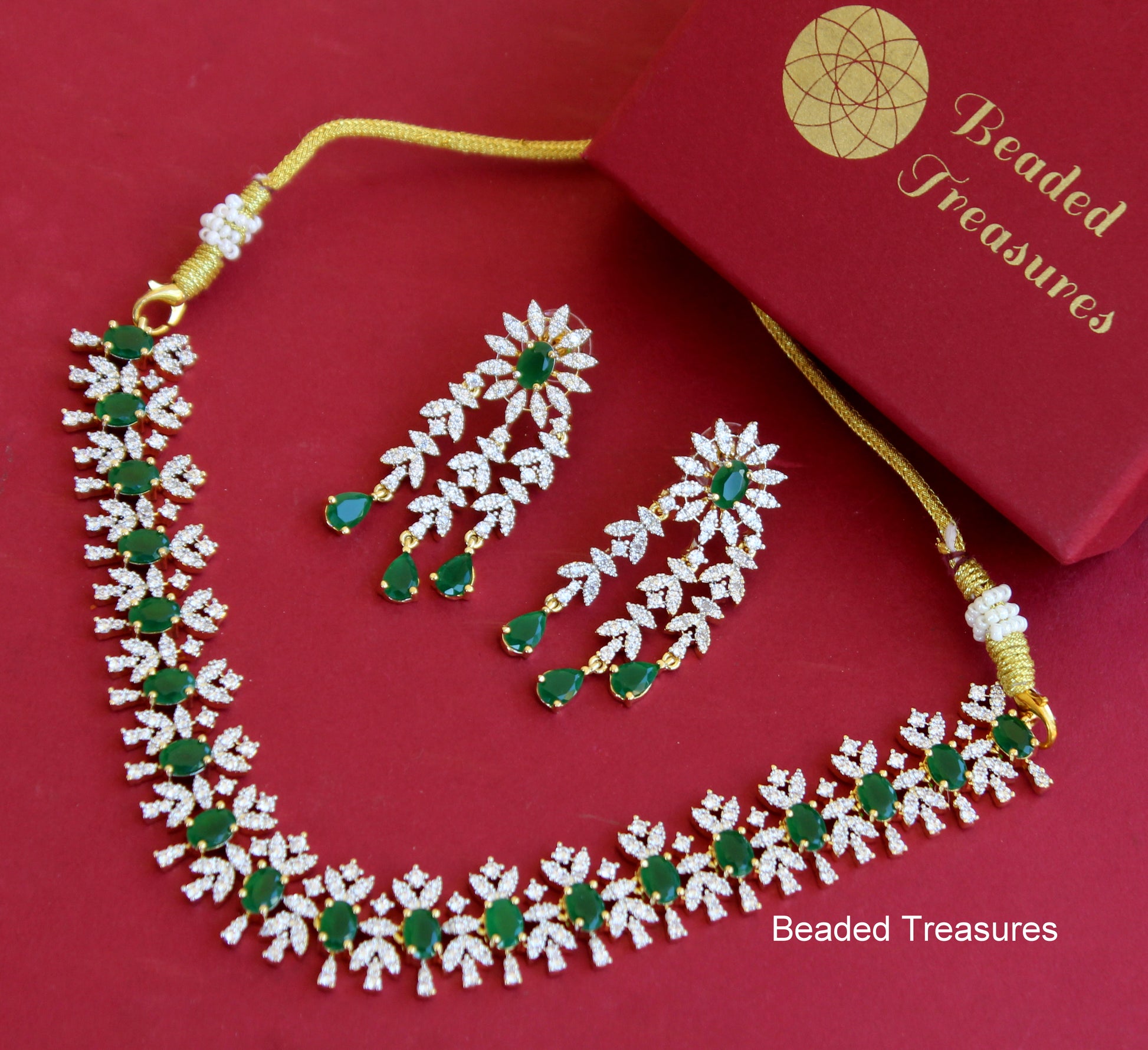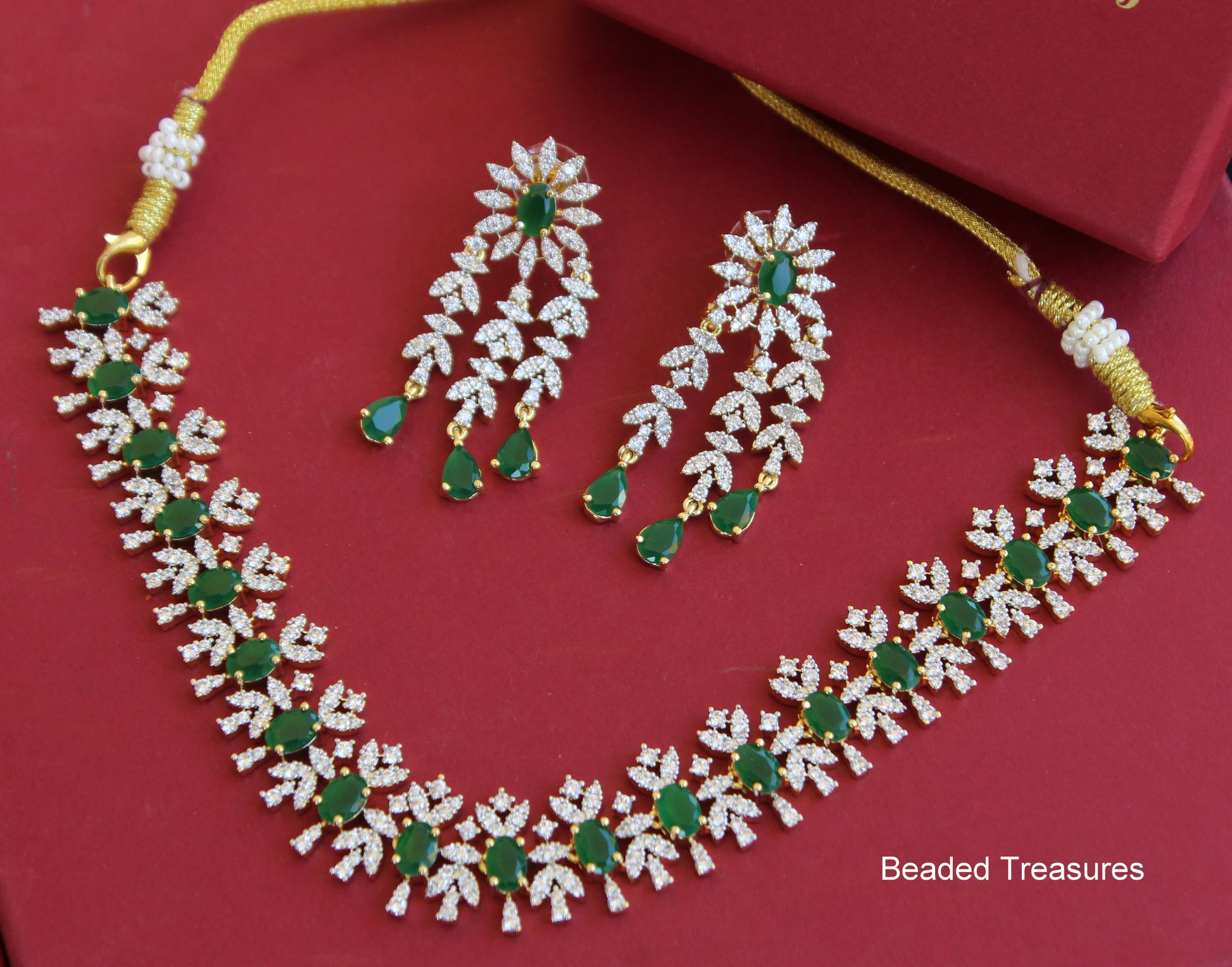 - Elegant Gold Plated American Diamond Dainty Necklace and Earrings, crafted by Beaded Treasures in Bengaluru.