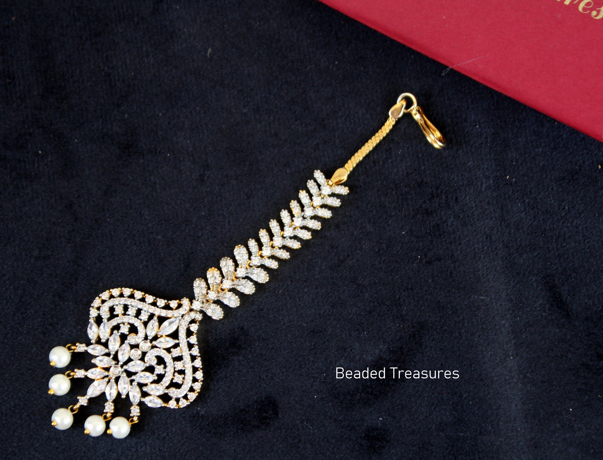 - Exquisite Gold Plated American Diamond (AD) Embellished Designer Maang Tikka, handcrafted by Beaded Treasures in Bengaluru.