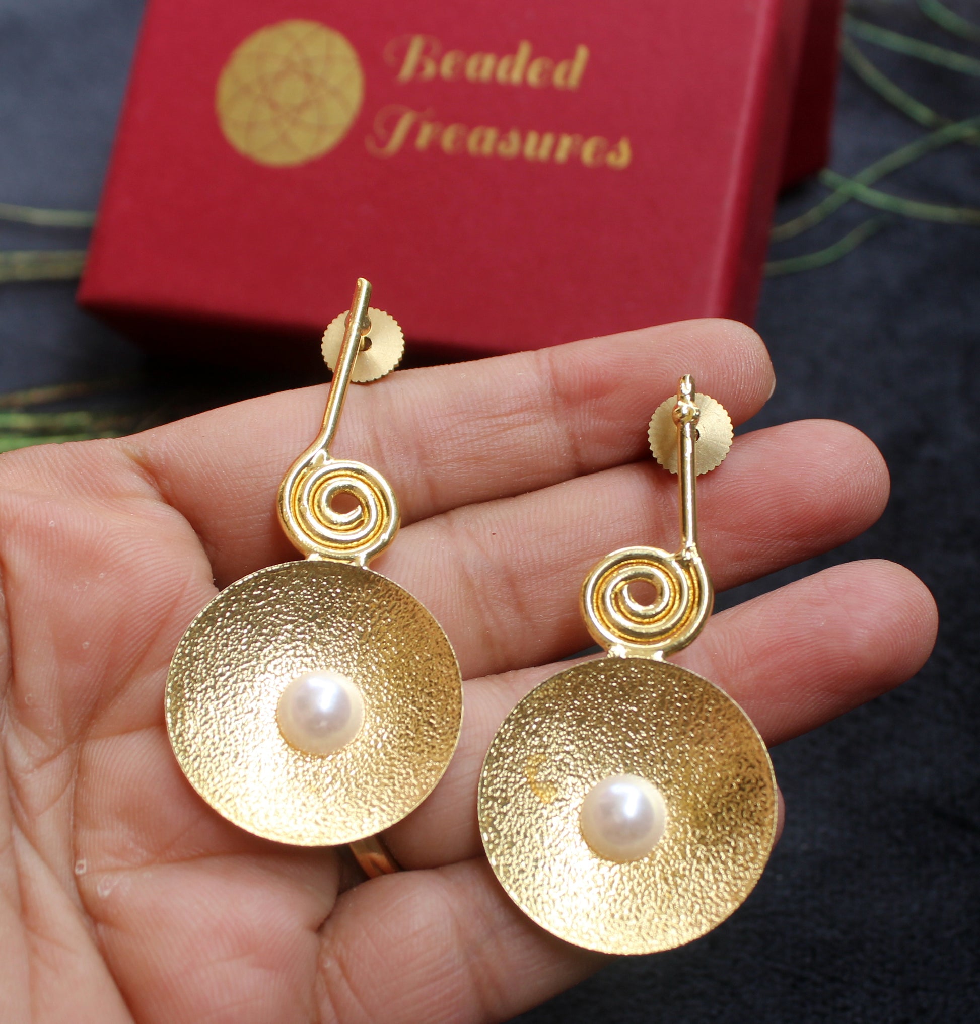 - Elegant Gold Plated Brass & Pearl Earrings, handcrafted by Beaded Treasures in Bengaluru.