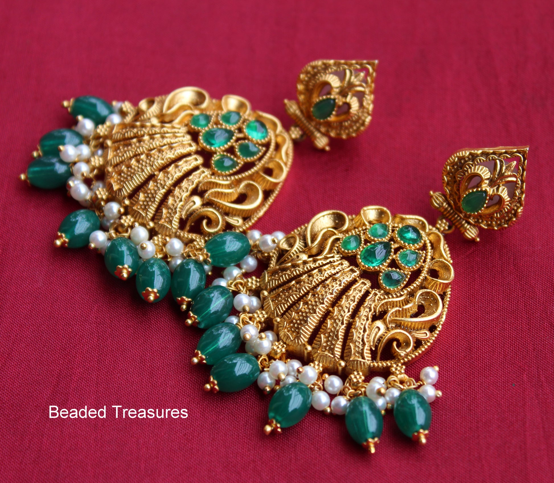 - Elegant Gold Plated Earrings with Green Stone & Pearl Drops, handcrafted by Beaded Treasures in Bengaluru.