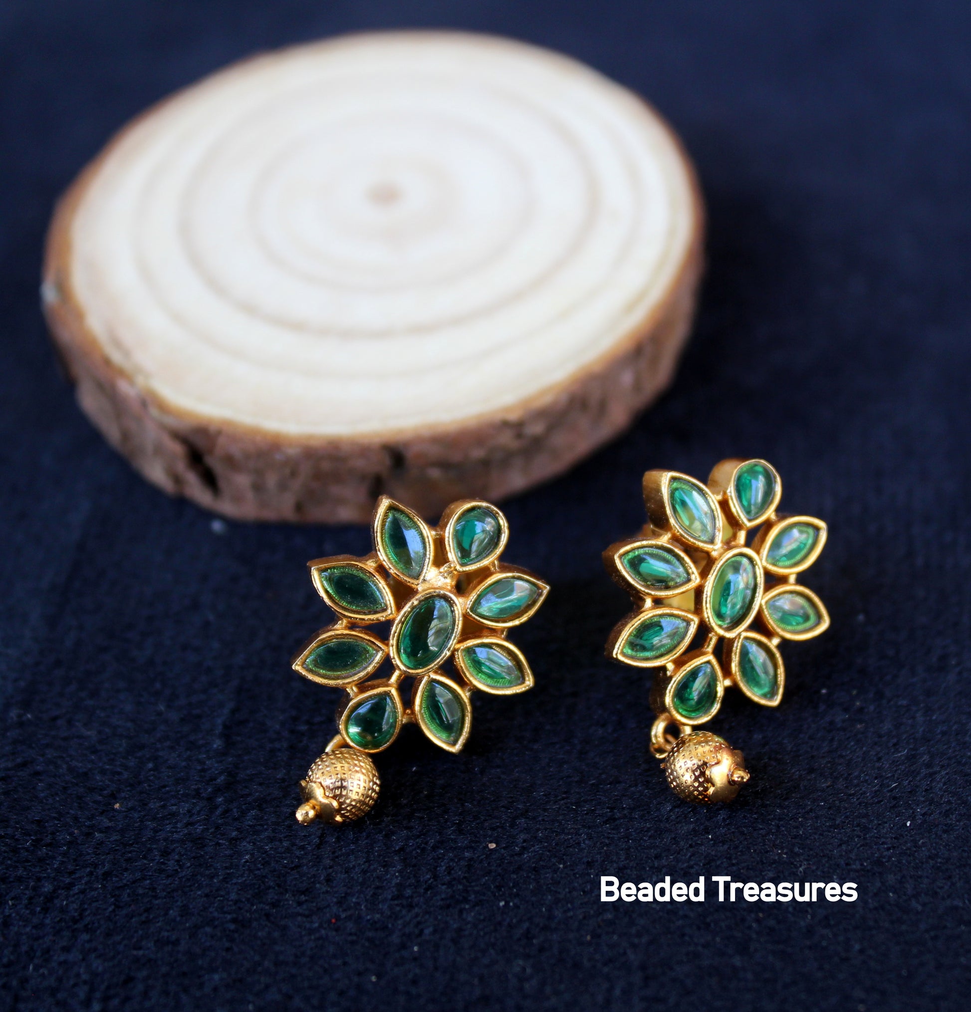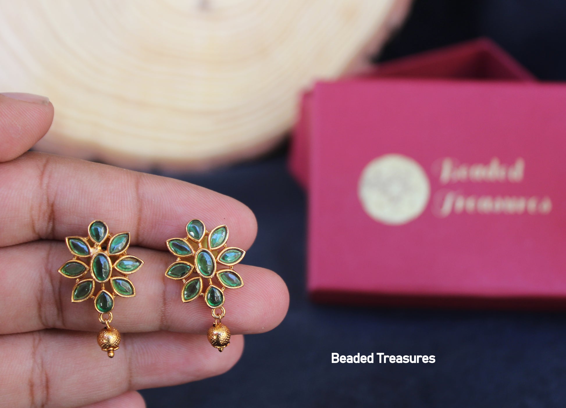 - Elegant Gold Plated Green Stone Floral Stud Earrings, handcrafted by Beaded Treasures in Bengaluru.