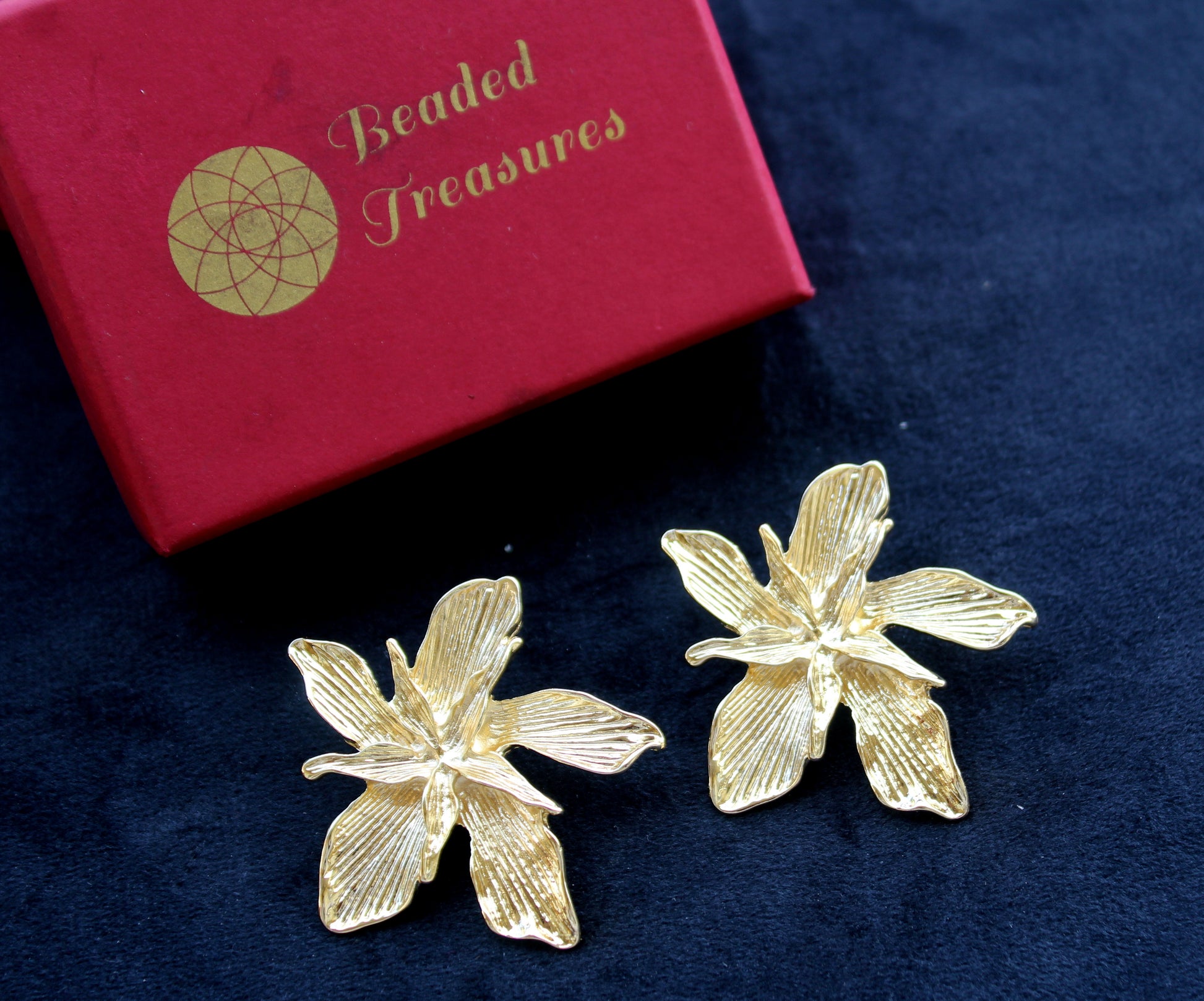 - Elegant Gold-Tone Flower Stud Earrings (40mm), handcrafted by Beaded Treasures in Bengaluru.