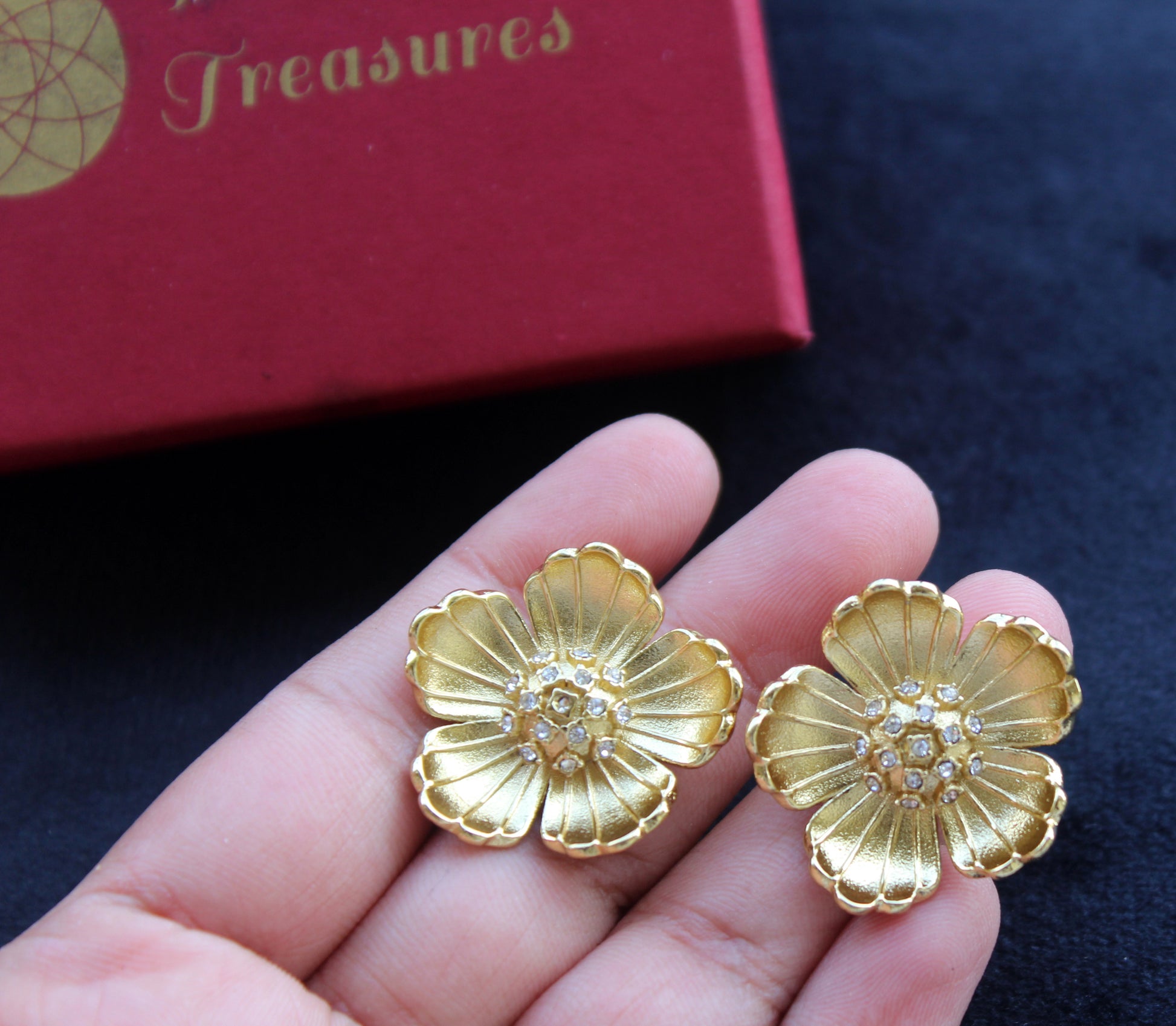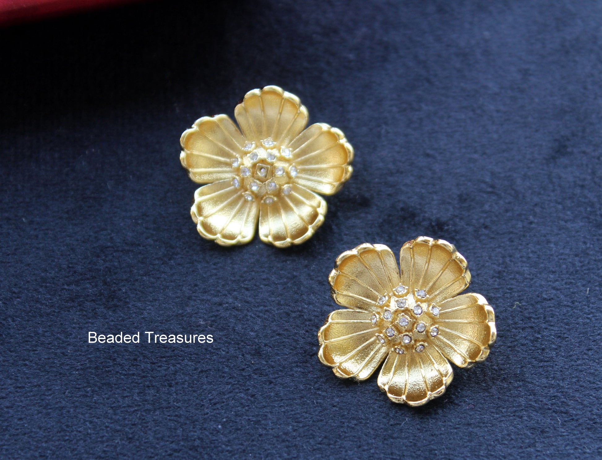 - Elegant Gold-Tone Flower Stud Earrings with Crystal Accents, handcrafted by Beaded Treasures in Bengaluru.