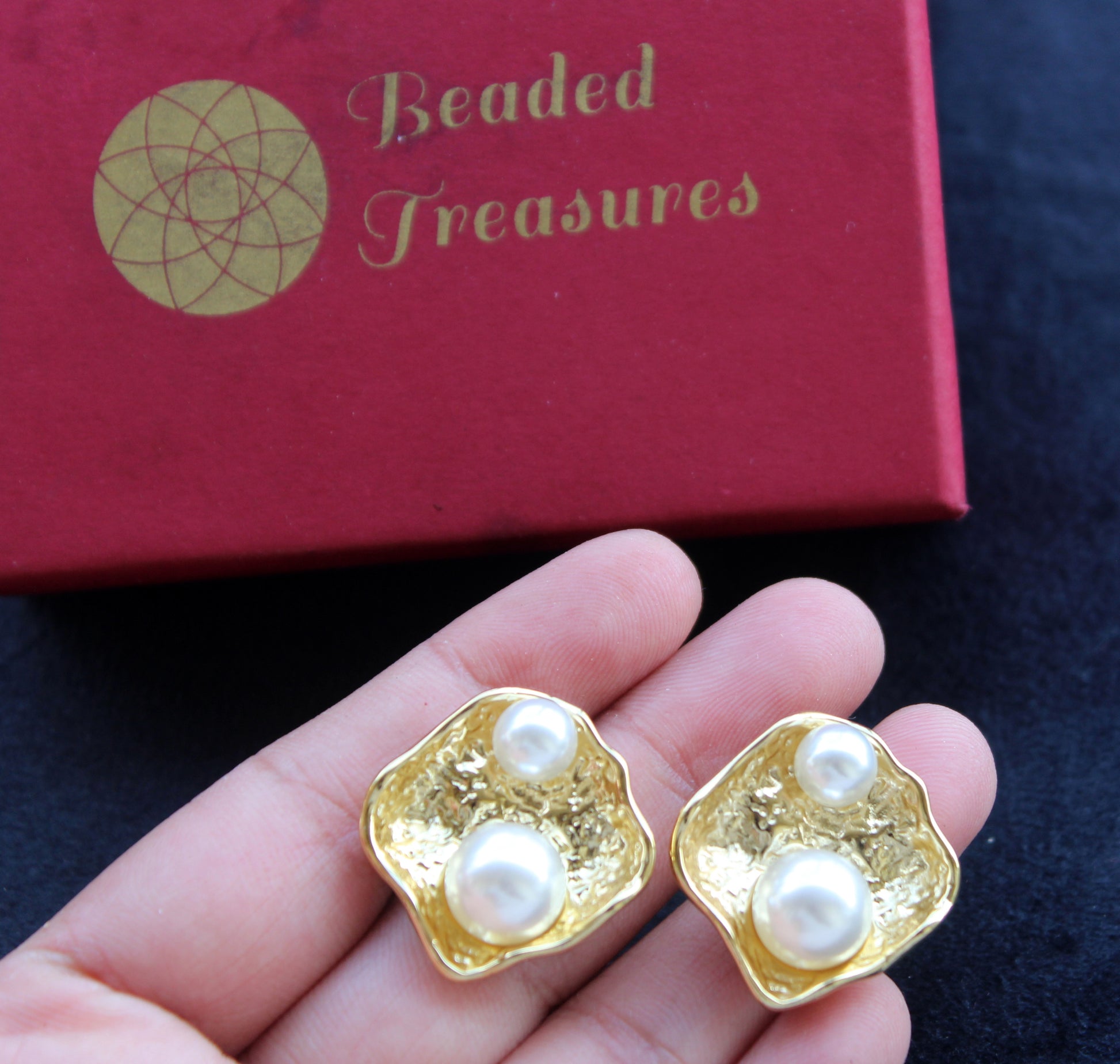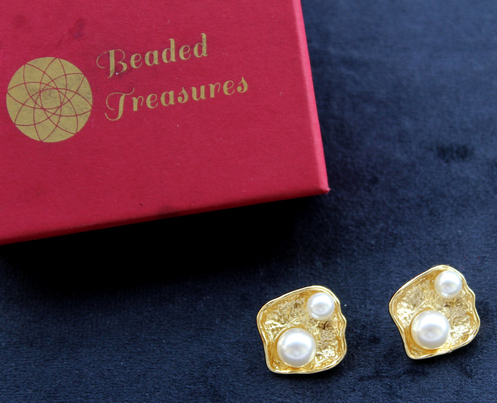 - Elegant Gold-Tone Textured Clip-On Earrings with Pearl Accents, handcrafted by Beaded Treasures in Bengaluru.