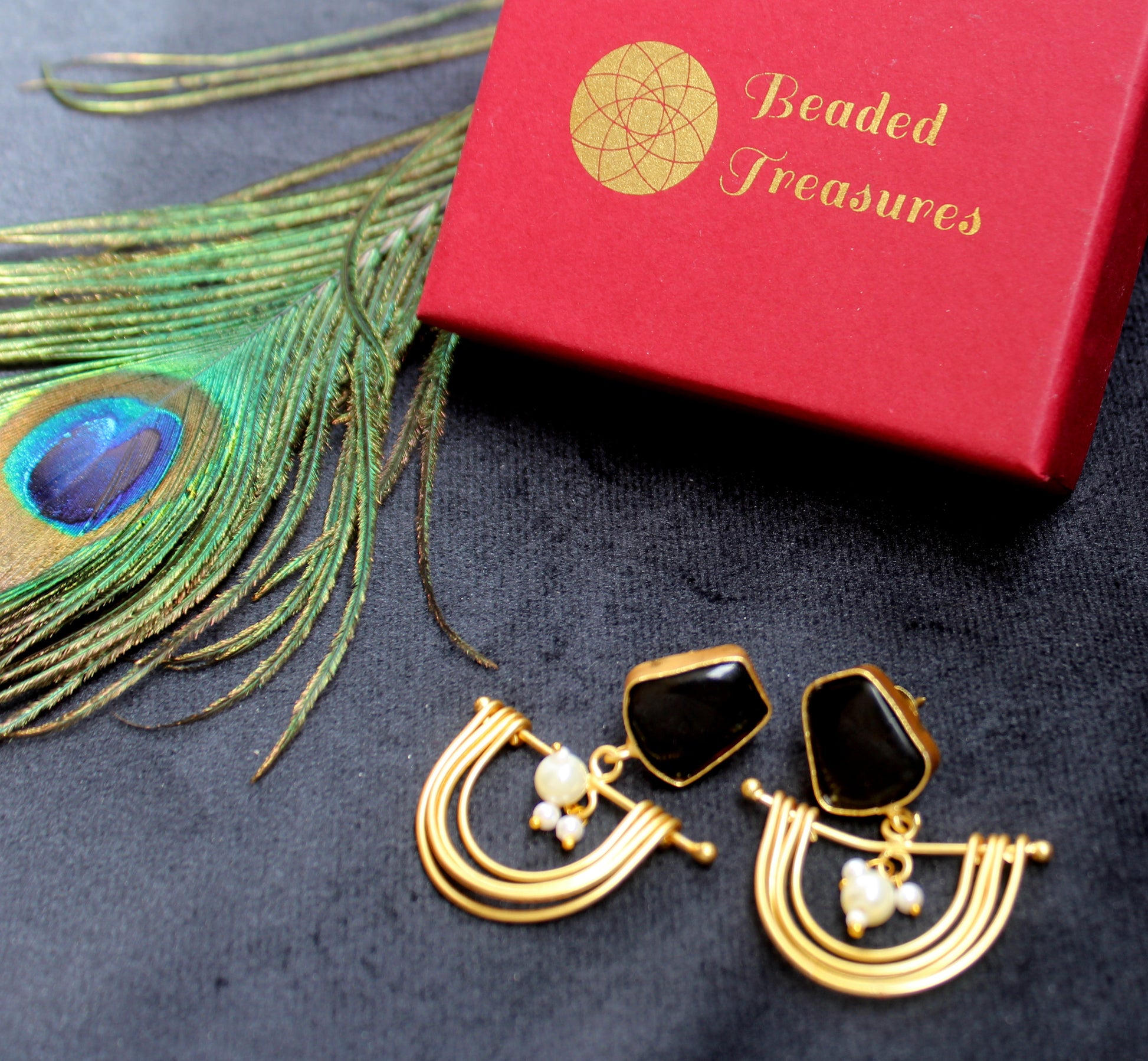 - Modern and elegant Gold-Toned Abstract Earrings featuring sleek black stones and delicate pearl accents, handcrafted by Beaded Treasures in Bengaluru.