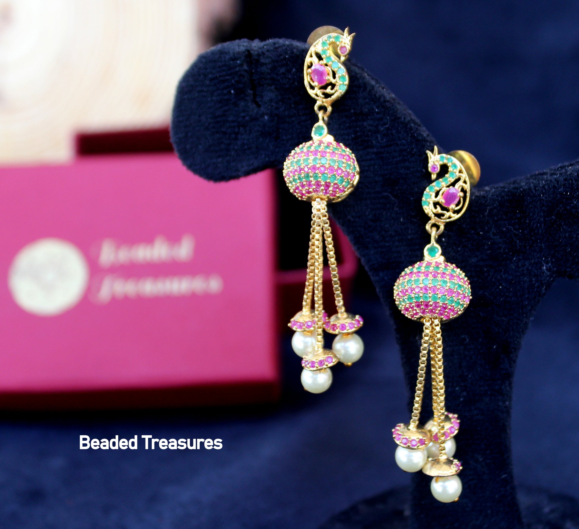 - Features a beautiful peacock motif at the top with stone accents (ruby-like and emerald-like), a CZ-encrusted ball with alternating ruby-like and emerald-like stones, gold-toned chain dangles, and delicate pearl drops.