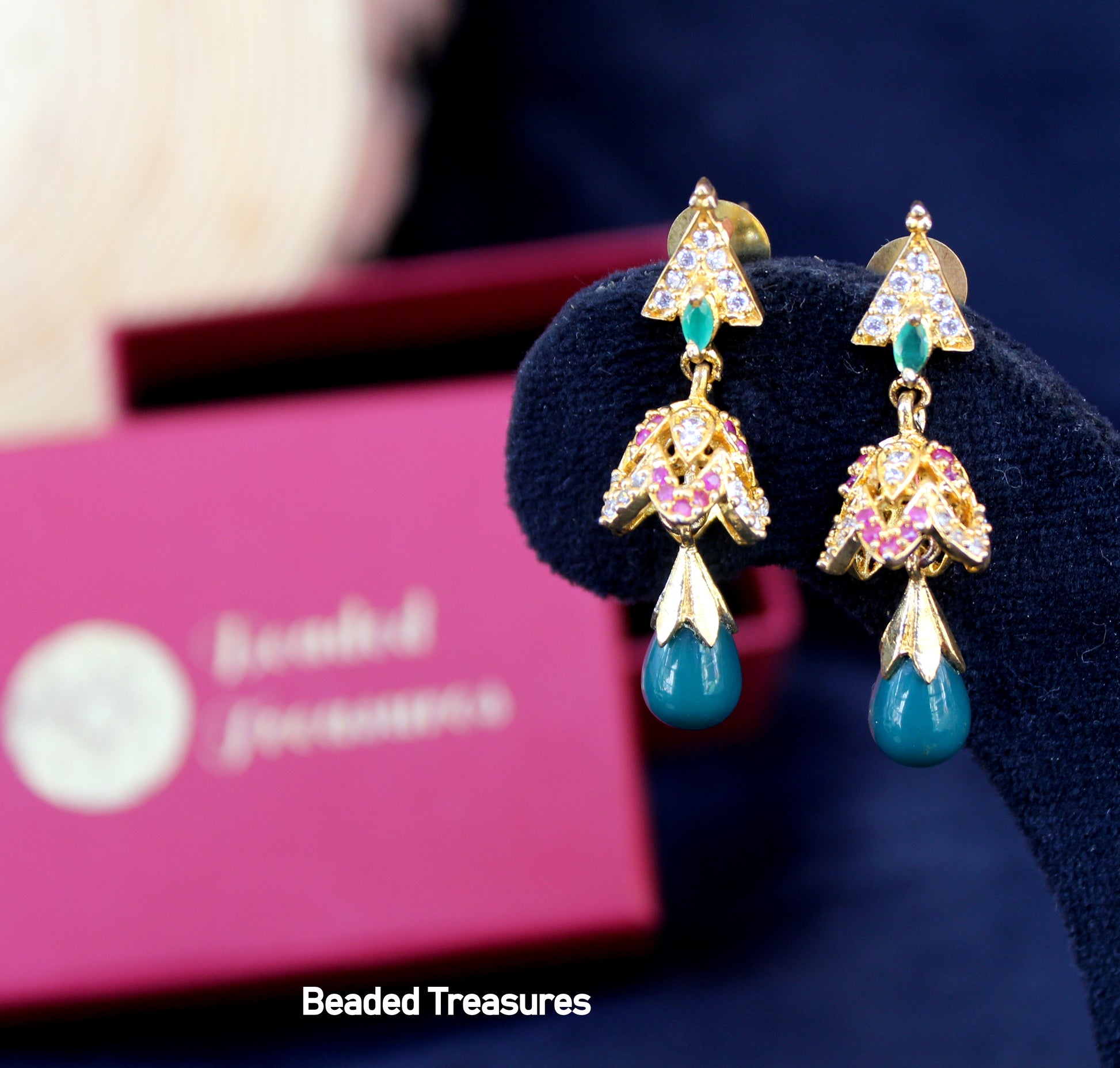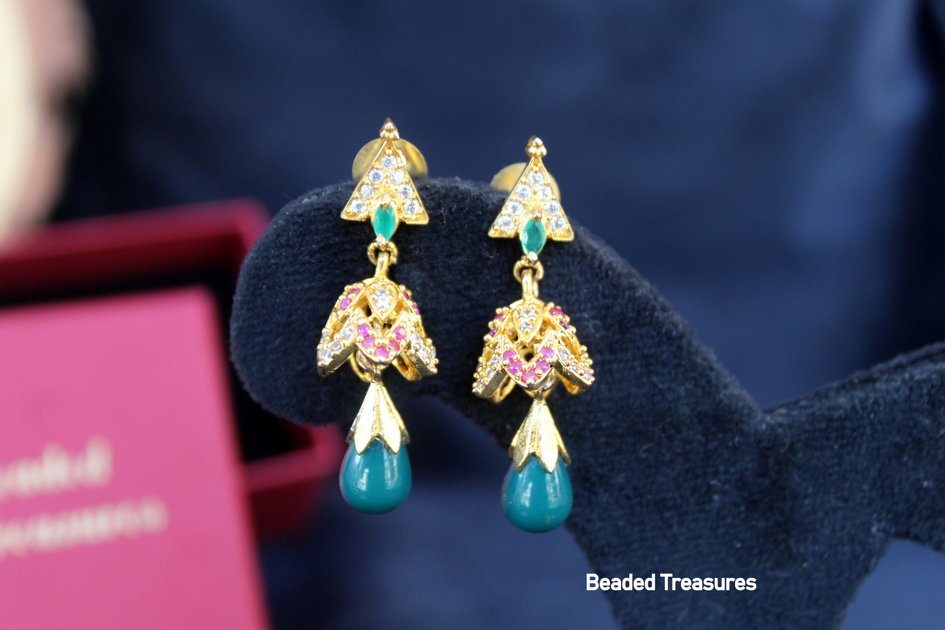 - Elegant Gold-Toned Jhumka Earrings with Stone Drops, handcrafted by Beaded Treasures in Bengaluru.