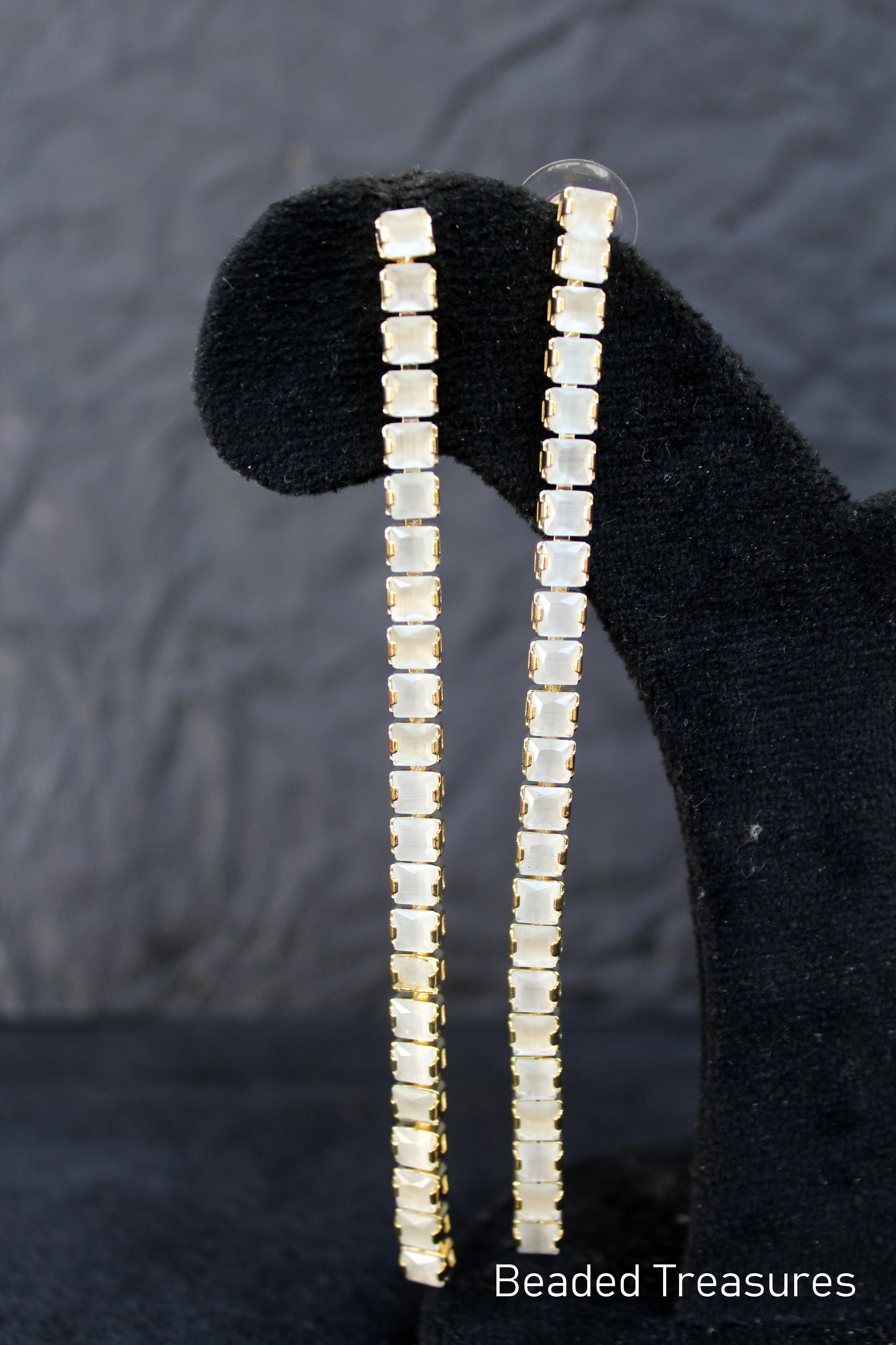- Elegant and sophisticated Gold-Toned Linear Drop Earrings featuring rows of sparkling clear stones, handcrafted by Beaded Treasures in Bengaluru.